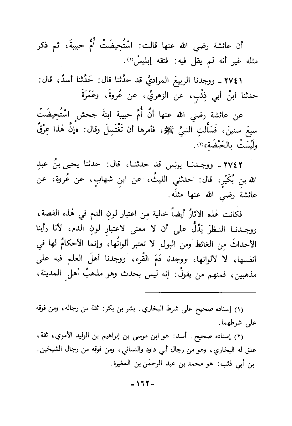 2742 - وَوَجَدْنَا يُونُسَ قَدْ حَدَّثَنَا قَالَ: حَدَّثَنَا يَحْيَى بْنُ عَبْدِ اللهِ بْنِ بُكَيْرٍ قَالَ: حَدَّثَنِي اللَّيْثُ، عَنِ ابْنِ شِهَابٍ، عَنْ عُرْوَةَ، عَنْ عَائِشَةَ رَضِيَ اللهُ عَنْهَا مِثْلَهُ فَكَانَتْ هَذِهِ الْآثَارُ أَيْضًا خَالِيَةً مِنِ اعْتِبَارِ لَوْنِ الدَّمِ فِي هَذِهِ الْقِصَّةِ , وَوَجَدْنَا النَّظَرَ يَدُلُّ عَلَى أَنْ لَا مَعْنَى لِاعْتِبَارِ لَوْنِ الدَّمِ , لِأَنَّا رَأَيْنَا الْأَحْدَاثَ مِنَ الْغَائِطِ وَمِنَ الْبَوْلِ لَا تُعْتَبَرُ أَلْوَانُهَا , وَإِنَّمَا الْأَحْكَامُ لَهَا فِي أَنْفُسِهَا , لَا لِأَلْوَانِهَا , وَوَجَدْنَا دَمَ الْقُرْءِ , وَوَجَدْنَا أَهْلَ الْعِلْمِ فِيهِ عَلَى مَذْهَبَيْنِ , فَمِنْهُمْ مَنْ يَقُولُ: إِنَّهُ لَيْسَ بِحَدَثٍ , وَهُوَ مَذْهَبُ أَهْلِ الْمَدِينَةِ , -[163]- وَمِنْهُمْ مَنْ يَذْهَبُ إِلَى أَنَّهُ حَدَثٌ , وَهُوَ مَذْهَبُ أَهْلِ الْكُوفَةِ , وَلَيْسَ أَحَدٌ مِنْهُمُ اعْتَبَرَ لَوْنَهُ , وَإِنَّمَا الْحُكْمُ عِنْدَهُ فِيهِ لِنَفْسِهِ , فَكَانَ مِثْلُ ذَلِكَ فِي النَّظَرِ دَمَ الْحَيْضِ يَكُونُ حُكْمُهُ حُكْمَ نَفْسِهِ لَا حُكْمَ لَوْنِهِ , وَاللهَ نَسْأَلُهُ التَّوْفِيقِ