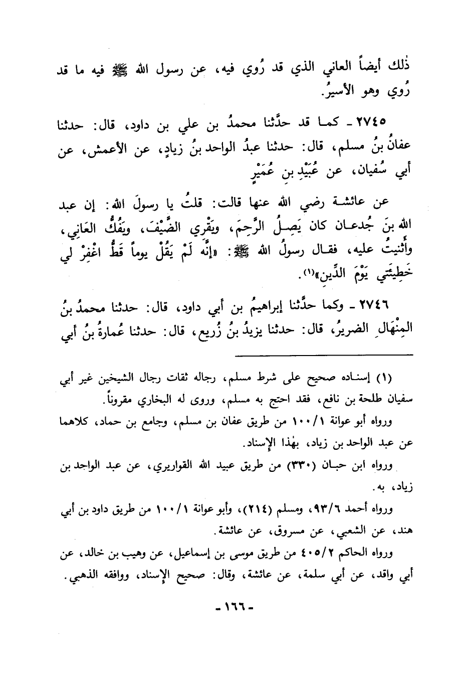 2745 - كَمَا قَدْ حَدَّثَنَا مُحَمَّدُ بْنُ عَلِيِّ بْنِ دَاوُدَ قَالَ: حَدَّثَنَا عَفَّانُ بْنُ مُسْلِمٍ قَالَ: حَدَّثَنَا عَبْدُ الْوَاحِدِ بْنُ زِيَادٍ، عَنِ الْأَعْمَشِ، عَنْ أَبِي سُفْيَانَ، عَنْ عُبَيْدِ بْنِ عُمَيْرٍ، عَنْ عَائِشَةَ رَضِيَ اللهُ عَنْهَا قَالَتْ: قُلْتُ: يَا رَسُولَ اللهِ , إِنَّ عَبْدَ اللهِ بْنَ جُدْعَانَ كَانَ يَصِلُ الرَّحِمَ، وَيُقْرِي الضَّيْفَ، وَيَفُكُّ الْعَانِيَ، وَأَثْنَيْتُ عَلَيْهِ , فَقَالَ رَسُولُ اللهِ صَلَّى اللَّهُ عَلَيْهِ وَسَلَّمَ: " إِنَّهُ لَمْ يَقُلْ يَوْمًا قَطُّ اغْفِرْ لِي خَطِيئَتِي يَوْمَ الدِّينِ "