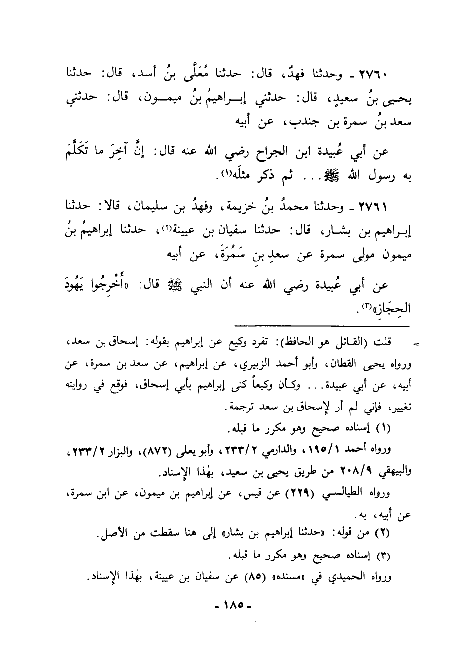 2761 - وَحَدَّثَنَا مُحَمَّدُ بْنُ خُزَيْمَةَ، وَفَهْدُ بْنُ سُلَيْمَانَ قَالَا: حَدَّثَنَا إِبْرَاهِيمُ بْنُ بَشَّارٍ قَالَ: حَدَّثَنَا سُفْيَانُ بْنُ عُيَيْنَةَ، ثنا إِبْرَاهِيمُ بْنُ مَيْمُونٍ مَوْلَى سَمُرَةَ عَنْ سَعْدِ بْنِ سَمُرَةَ، عَنْ أَبِيهِ، عَنْ أَبِي عُبَيْدَةَ رَضِيَ اللهُ عَنْهُ أَنَّ النَّبِيَّ صَلَّى اللَّهُ عَلَيْهِ وَسَلَّمَ قَالَ: " أَخْرِجُوا يَهُودَ الْحِجَازِ " -[186]- قَالَ لَنَا: فَهْدٌ قَالَ: الرَّمَادِيُّ يَعْنِي إِبْرَاهِيمَ بْنَ بَشَّارٍ لَمْ يَرْوِ ابْنُ عُيَيْنَةَ عَنْ هَذَا الشَّيْخِ إِلَّا هَذَا الْحَدِيثَ