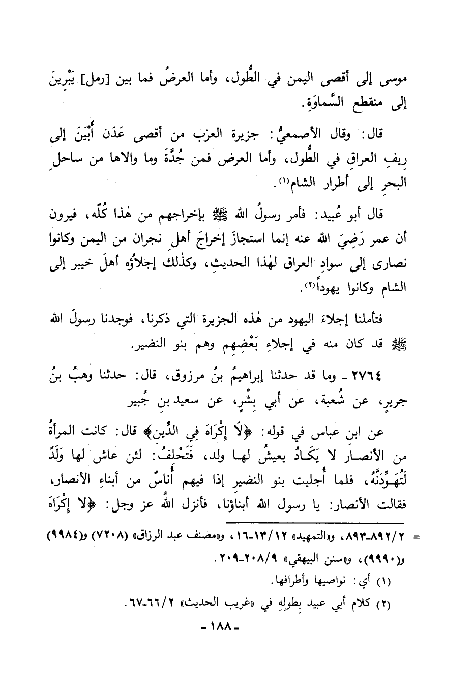 2764 - وَمَا قَدْ حَدَّثَنَا إِبْرَاهِيمُ بْنُ مَرْزُوقٍ قَالَ: حَدَّثَنَا وَهْبُ بْنُ جَرِيرٍ، عَنْ شُعْبَةَ، عَنْ أَبِي بِشْرٍ، عَنْ سَعِيدِ بْنِ جُبَيْرٍ، عَنِ ابْنِ عَبَّاسٍ فِي قَوْلِهِ {لَا إِكْرَاهَ فِي الدِّينِ} [البقرة: 256] قَالَ: كَانَتِ الْمَرْأَةُ مِنَ الْأَنْصَارِ لَا يَكَادُ يَعِيشُ لَهَا وَلَدٌ فَتَحْلِفُ لَئِنْ عَاشَ لَهَا وَلَدٌ لَتُهَوِّدَنَّهُ فَلَمَّا أُجْلِيَتْ بَنُو النَّضِيرِ إِذَا فِيهِمْ أُنَاسٌ مِنْ أَبْنَاءِ الْأَنْصَارِ , فَقَالَتِ الْأَنْصَارُ يَا رَسُولَ اللهِ , أَبْنَاؤُنَا , فَأَنْزَلَ اللهُ عَزَّ وَجَلَّ: {لَا إِكْرَاهَ -[189]- فِي الدِّينِ} [البقرة: 256] قَالَ سَعِيدٌ: فَمَنْ شَاءَ لَحِقَ بِهِمْ , وَمَنْ شَاءَ دَخَلَ فِي الْإِسْلَامِ؛ فَهَذَا رَسُولُ اللهِ صَلَّى اللَّهُ عَلَيْهِ وَسَلَّمَ قَدْ أَجْلَى مِنَ الْيَهُودِ مَنْ أَجْلَى فِي حَيَاتِهِ. فَأَمَّا مَا رُوِيَ عَنْ عُمَرَ بْنِ الْخَطَّابِ رَضِيَ اللهُ عَنْهُ فِيمَنْ أُجْلَى مِنْهُمْ فِي خِلَافَتِهِ