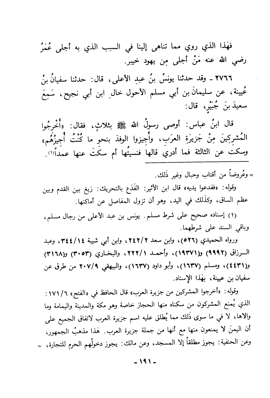 2766 - وَقَدْ حَدَّثَنَا يُونُسُ بْنُ عَبْدِ الْأَعْلَى قَالَ: حَدَّثَنَا سُفْيَانُ بْنُ عُيَيْنَةَ، عَنْ سُلَيْمَانَ بْنِ أَبِي مُسْلِمٍ الْأَحْوَلِ خَالِ ابْنِ أَبِي نَجِيحٍ سَمِعَ سَعِيدَ بْنَ جُبَيْرٍ، قَالَ: قَالَ ابْنُ عَبَّاسٍ: أَوْصَى رَسُولُ اللهِ صَلَّى اللَّهُ عَلَيْهِ وَسَلَّمَ بِثَلَاثٍ , فَقَالَ: " أَخْرِجُوا الْمُشْرِكِينَ مِنْ جَزِيرَةِ الْعَرَبِ , وَأَجِيزُوا الْوَفْدَ بِنَحْوِ مَا كُنْتُ أُجِيزُهُمْ " وَسَكَتَ عَنِ الثَّالِثَةِ , فَمَا أَدْرِي قَالَهَا , فَنَسِيتُهَا أَمْ سَكَتَ عَنْهَا عَمْدًا -[192]- قَالَ أَبُو جَعْفَرٍ: فَهَذَا الْحَدِيثُ فِيهِ خِلَافُ مَا قَدْ رَوَيْنَا قَبْلَهُ فِي هَذَا الْبَابِ مِنَ الَّذِينَ أَمَرَ رَسُولُ اللهِ صَلَّى اللَّهُ عَلَيْهِ وَسَلَّمَ بِإِجْلَائِهِمْ مِنْ جَزِيرَةِ الْعَرَبِ ; لِأَنَّ الَّذِينَ أَمَرَ بِإِجْلَائِهِمْ مِنْهَا فِيمَا رَوَيْنَاهُ فِيمَا تَقَدَّمَ مِنَّا فِي هَذَا الْبَابِ هُمُ الْيَهُودُ، وَالنَّصَارَى , وَالَّذِي فِي هَذَا هُمُ الْمُشْرِكُونَ , وَهُمْ خِلَافُ الْيَهُودِ، وَالنَّصَارَى غَيْرَ أَنَّا نَخَافُ أَنْ يَكُونَ ذَلِكَ إِنَّمَا أُتِيَ مِنْ قِبَلِ ابْنِ عُيَيْنَةَ ; لِأَنَّهُ كَانَ يُحَدِّثُ مِنْ حِفْظِهِ , فَيَحْتَمِلُ أَنْ يَكُونَ جَعَلَ مَكَانَ الْيَهُودِ وَالنَّصَارَى الْمُشْرِكِينَ , وَلَمْ يَكُنْ مَعَهُ مِنَ الْفِقْهِ مَا يُمَيِّزُ بِهِ بَيْنَ ذَلِكَ وَاللهُ أَعْلَمُ بِحَقِيقَةِ الْأَمْرِ فِي ذَلِكَ غَيْرَ أَنَّ الْجَمَاعَةَ أَوْلَى بِمَا حَفِظُوا فِي ذَلِكَ مِمَّا حَفِظَهُ الْوَاحِدُ مِمَّا خَالَفَهُمْ فِيهِ. وَدَلَّ عَلَى مَا ذَكَرْنَا مِمَّا قُلْنَاهُ فِي ذَلِكَ