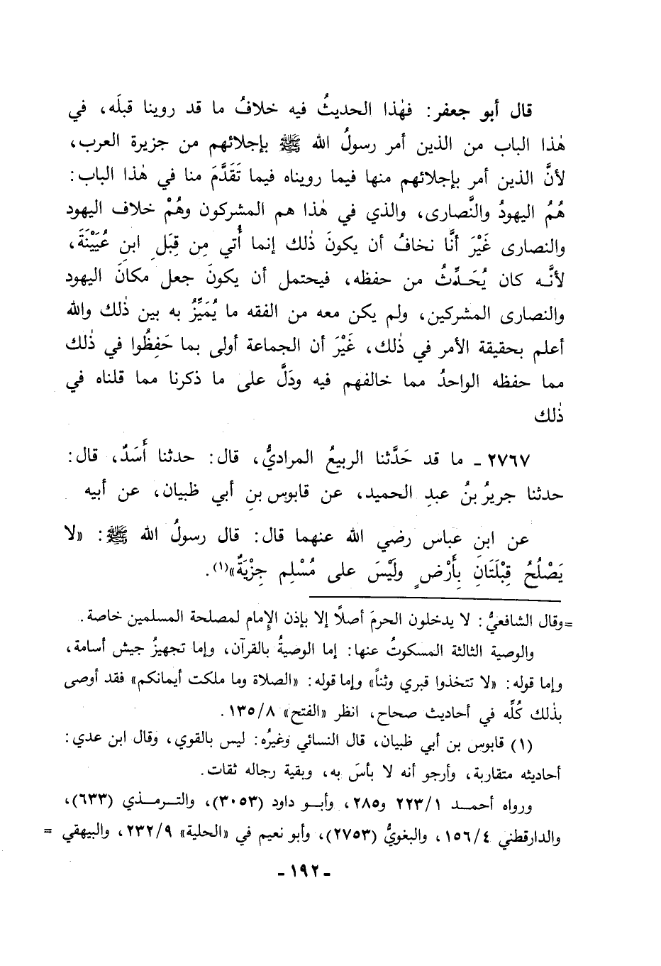 2767 - مَا قَدْ حَدَّثَنَا الرَّبِيعُ الْمُرَادِيُّ قَالَ: حَدَّثَنَا أَسَدٌ قَالَ: حَدَّثَنَا جَرِيرُ بْنُ عَبْدِ الْحَمِيدِ، عَنْ قَابُوسَ بْنِ أَبِي ظَبْيَانَ، عَنْ أَبِيهِ، عَنِ ابْنِ عَبَّاسٍ رَضِيَ اللهُ عَنْهُمَا قَالَ: قَالَ رَسُولُ اللهِ صَلَّى اللَّهُ عَلَيْهِ وَسَلَّمَ: " لَا يَصْلُحُ قِبْلَتَانِ بِأَرْضٍ وَلَيْسَ عَلَى مُسْلِمٍ جِزْيَةٌ " -[194]- فَدَلَّ مَعْنَى قَوْلِهِ " وَلَيْسَ عَلَى مُسْلِمٍ جِزْيَةٌ " بَعْدَ قَوْلِهِ " لَا يَصْلُحُ قِبْلَتَانِ بِأَرْضٍ " أَنَّهُ أَرَادَ بِذَلِكَ أَنَّ الْمُسْلِمَ الَّذِي لَيْسَ عَلَيْهِ جِزْيَةٌ هُوَ الَّذِي كَانَ قَبْلَ إِسْلَامِهِ عَلَيْهِ الْجِزْيَةُ وَهُمُ الْيَهُودُ وَالنَّصَارَى لَا الْمُشْرِكِينَ مِنَ الْعَرَبِ , وَدَلَّ ذِكْرُهُ الْقِبْلَةَ أَنَّهُ أَرَادَ مَنْ يَدِينُ بِدِينٍ لَا مَنْ لَا دِينَ لَهُ وَالْيَهُودُ وَالنَّصَارَى فَيَدِينُونَ بِمَا يَدِينُونَ بِهِ فَهُمْ ذَوُو قِبْلَةٍ , وَالْمُشْرِكُونَ لَا يَدِينُونَ بِشَيْءٍ , فَلَيْسُوا بِذَوِي قِبْلَةٍ , وَفِي ذَلِكَ مَعْنًى آخَرُ لَطِيفٌ مِمَّا يَجِبُ أَنْ يُوقَفَ عَلَيْهِ , وَهُوَ أَنَّ الَّذِي كَانَ أَوْصَى بِهِ رَسُولُ اللهِ صَلَّى اللَّهُ عَلَيْهِ وَسَلَّمَ مِمَّا ذُكِرَ فِي حَدِيثِ ابْنِ عَبَّاسٍ الَّذِي رَوَيْنَاهُ عَنْ يُونُسَ إِنَّمَا كَانَ فِي مَرَضِ مَوْتِهِ صَلَّى اللَّهُ عَلَيْهِ وَسَلَّمَ بَعْدَمَا أَفْنَى اللهُ الشِّرْكَ وَأَهْلَهُ بِرَسُولِ اللهِ صَلَّى اللَّهُ عَلَيْهِ وَسَلَّمَ بِدُخُولِهِمْ فِي الْإِسْلَامِ , وَبِقَتْلِ مَنْ أَبَى مِنْهُمُ الدُّخُولَ فِي الْإِسْلَامِ كَمَا قَالَ اللهُ عَزَّ وَجَلَّ {وَلَهُ أَسْلَمَ مَنْ فِي السَّمَوَاتِ وَالْأَرْضِ طَوْعًا وَكَرْهًا} , فَكَانَ مَنْ أَسْلَمَ طَوْعًا وَكَرْهًا هُمُ الَّذِينَ أَسْلَمُوا , وَكَانَ مَنْ سِوَاهُمْ مِمَّنْ أَفْنَاهُمُ الْقَتْلُ , فَلَمْ يَكُنْ حِينَ أَوْصَى رَسُولُ اللهِ صَلَّى اللَّهُ عَلَيْهِ وَسَلَّمَ بِمَا أَوْصَى بِهِ مِمَّا ذَكَرْنَا أَحَدٌ , -[195]- فَكَيْفَ يَجُوزُ أَنْ يُوصِيَ بِإِخْرَاجِ مَعْدُومِينَ , وَإِنَّمَا كَانَتْ وَصِيَّتُهُ صَلَّى اللَّهُ عَلَيْهِ وَسَلَّمَ بِإِخْرَاجِ مَوْجُودِينَ , وَهُمُ الْيَهُودُ وَالنَّصَارَى , وَاللهَ نَسْأَلُهُ التَّوْفِيقَ