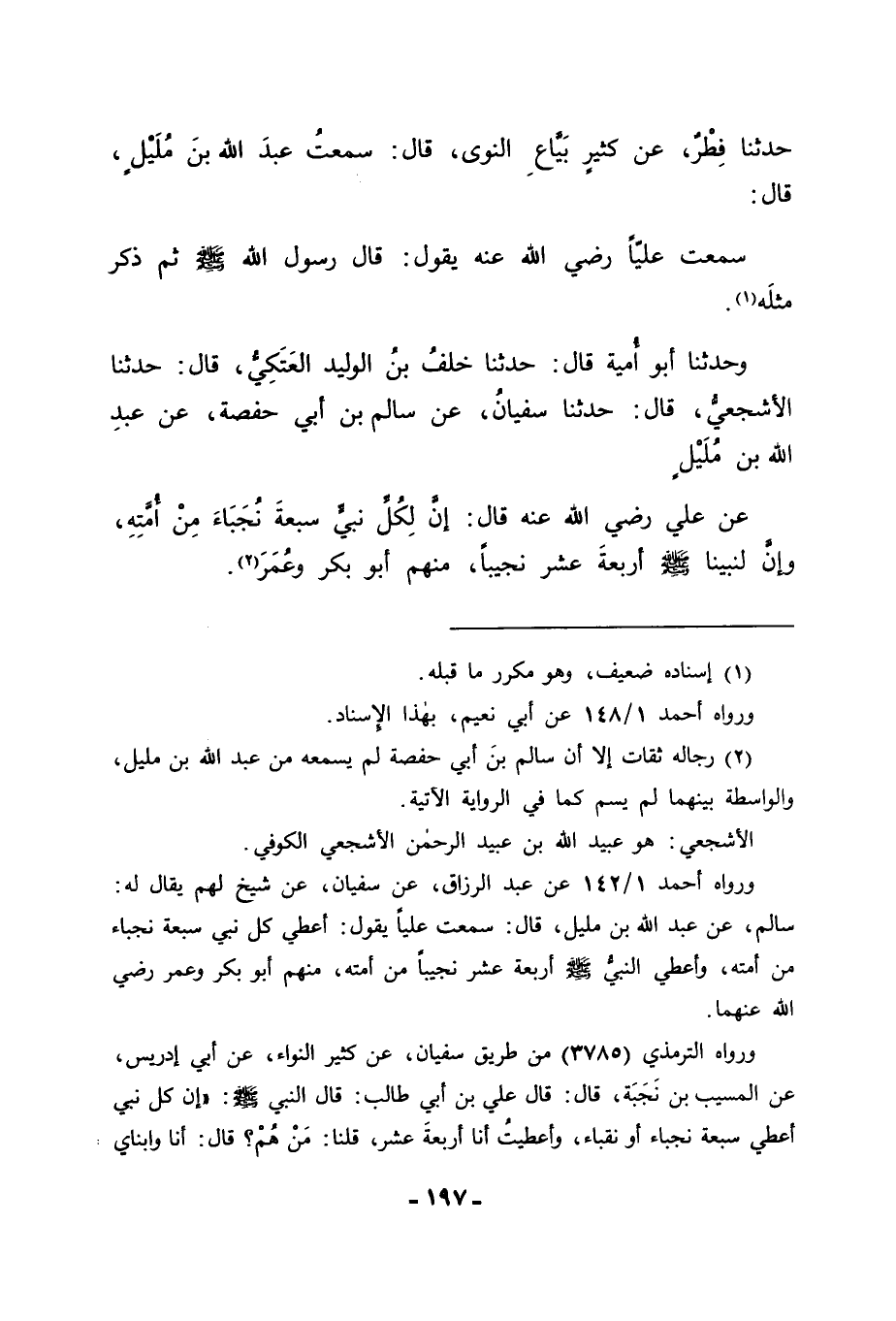 وَحَدَّثَنَا أَبُو أُمَيَّةَ قَالَ: حَدَّثَنَا خَلَفُ بْنُ الْوَلِيدِ الْعَتَكِيُّ قَالَ: حَدَّثَنَا الْأَشْجَعِيُّ قَالَ: ثنا سُفْيَانُ، عَنْ سَالِمِ بْنِ أَبِي حَفْصَةَ، عَنْ عَبْدِ اللهِ بْنِ مُلَيْلٍ، عَنْ عَلِيٍّ رَضِيَ اللهُ عَنْهُ قَالَ: " إِنَّ لِكُلِّ نَبِيٍّ سَبْعَةَ نُجَبَاءَ مِنْ أُمَّتِهِ , وَإِنَّ لِنَبِيِّنَا صَلَّى اللَّهُ عَلَيْهِ وَسَلَّمَ أَرْبَعَةَ عَشَرَ نَجِيبًا مِنْهُمْ أَبُو بَكْرٍ، وَعُمَرُ "