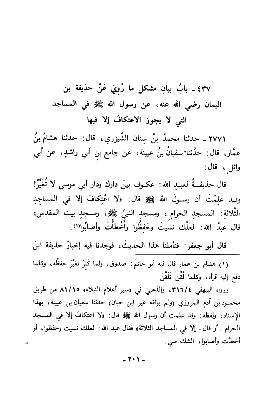 2771 - حَدَّثَنَا مُحَمَّدُ بْنُ سِنَانٍ الشَّيْزَرِيُّ قَالَ: حَدَّثَنَا هِشَامُ بْنُ عَمَّارٍ قَالَ: حَدَّثَنَا سُفْيَانُ بْنُ عُيَيْنَةَ، عَنْ جَامِعِ بْنِ أَبِي رَاشِدٍ، عَنْ أَبِي وَائِلٍ قَالَ: قَالَ حُذَيْفَةُ لِعَبْدِ اللهِ: عُكُوفٌ بَيْنَ دَارِكَ وَدَارِ أَبِي مُوسَى لَا تُغَيِّرُ , وَقَدْ عَلِمْتَ أَنَّ رَسُولَ اللهِ صَلَّى اللَّهُ عَلَيْهِ وَسَلَّمَ قَالَ: " لَا اعْتِكَافَ إِلَّا فِي الْمَسَاجِدِ الثَّلَاثَةِ: الْمَسْجِدِ الْحَرَامِ وَمَسْجِدِ النَّبِيِّ صَلَّى اللَّهُ عَلَيْهِ وَسَلَّمَ وَمَسْجِدِ بَيْتِ الْمَقْدِسِ " قَالَ: عَبْدُ اللهِ لَعَلَّكَ نَسِيتَ وَحَفِظُوا , وَأَخْطَأْتَ وَأَصَابُوا. قَالَ أَبُو جَعْفَرٍ: فَتَأَمَّلْنَا هَذَا الْحَدِيثَ فَوَجَدْنَا فِيهِ إِخْبَارَ حُذَيْفَةَ ابْنَ -[205]- مَسْعُودٍ أَنَّهُ قَدْ عَلِمَ مَا ذَكَرَهُ لَهُ عَنِ النَّبِيِّ صَلَّى اللَّهُ عَلَيْهِ وَسَلَّمَ وَتَرْكَ ابْنِ مَسْعُودٍ إِنْكَارَ ذَلِكَ عَلَيْهِ وَجَوَابَهُ إِيَّاهُ بِمَا أَجَابَهُ بِهِ فِي ذَلِكَ مِنْ قَوْلِهِ: " لَعَلَّهُمْ حَفِظُوا " نَسَخَ مَا قَدْ ذَكَرْتُهُ مِنْ ذَلِكَ , وَأَصَابُوا فِيمَا قَدْ فَعَلُوا , وَكَانَ ظَاهِرُ الْقُرْآنِ يَدُلُّ عَلَى ذَلِكَ وَهُوَ قَوْلُهُ عَزَّ وَجَلَّ: {وَلَا تُبَاشِرُوهُنَّ وَأَنْتُمْ عَاكِفُونَ فِي الْمَسَاجِدِ} [البقرة: 187] , فَعَمَّ الْمَسَاجِدَ كُلَّهَا بِذَلِكَ , وَكَانَ الْمُسْلِمُونَ عَلَيْهِ مِنَ الِاعْتِكَافِ فِي مَسَاجِدِ بُلْدَانِهِمْ , إِمَّا مَسَاجِدُ الْجَمَاعَاتِ الَّتِي -[206]- تُقَامُ فِيهَا الْجُمُعَاتُ , وَإِمَّا هِيَ وَمَا سِوَاهَا مِنَ الْمَسَاجِدِ الَّتِي لَهَا الْأَئِمَّةُ وَالْمُؤَذِّنُونَ عَلَى مَا قَالَهُ أَهْلُ الْعِلْمِ فِي ذَلِكَ , وَاللهَ عَزَّ وَجَلَّ نَسْأَلُهُ التَّوْفِيقَ