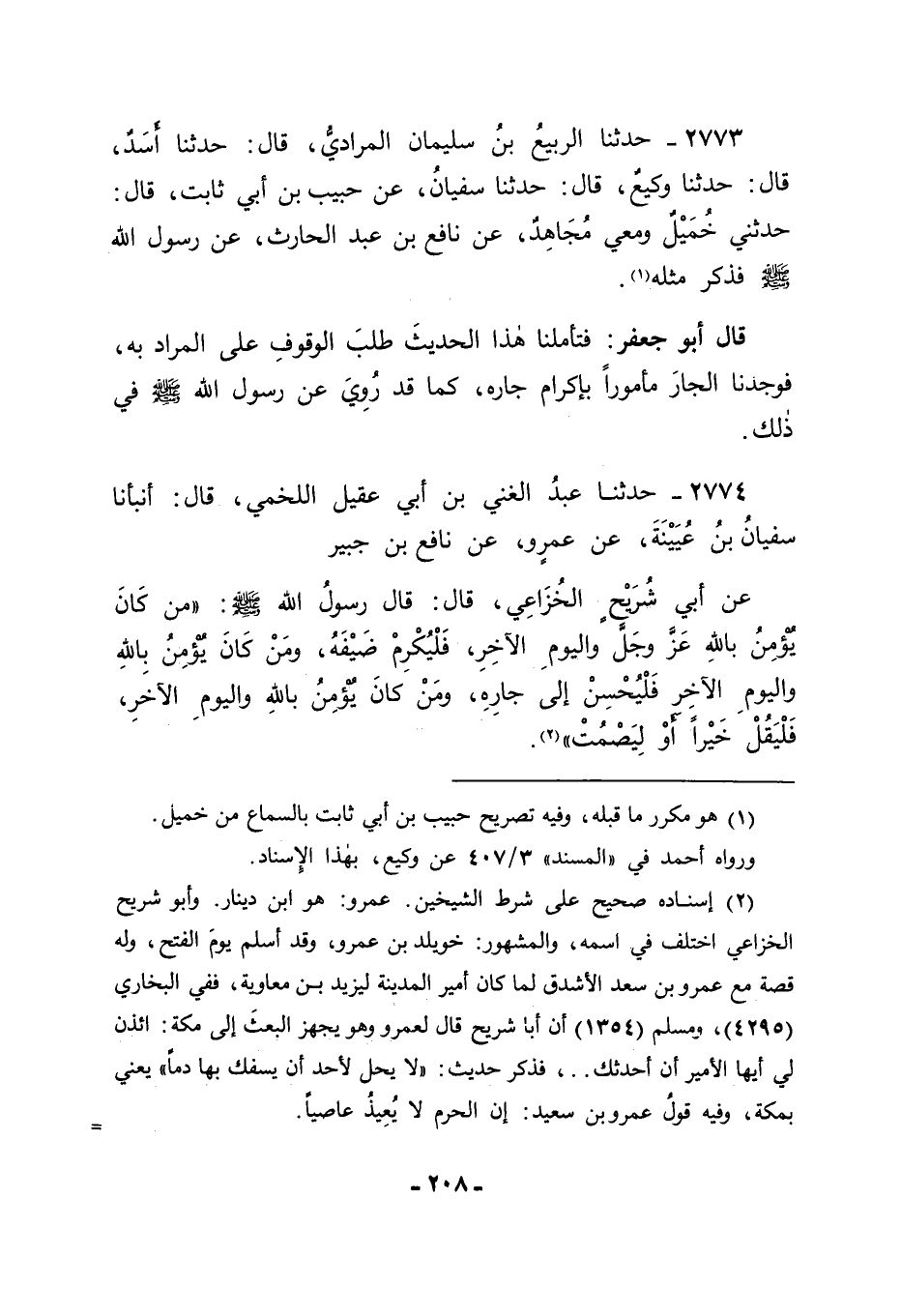 2774 - حَدَّثَنَا عَبْدُ الْغَنِيِّ بْنُ أَبِي عَقِيلٍ اللَّخْمِيُّ قَالَ: حَدَّثَنَا سُفْيَانُ بْنُ عُيَيْنَةَ، عَنْ عَمْرٍو، عَنْ نَافِعِ بْنِ جُبَيْرٍ، عَنْ أَبِي شُرَيْحٍ الْخُزَاعِيُّ قَالَ: قَالَ رَسُولُ اللهِ صَلَّى اللَّهُ عَلَيْهِ وَسَلَّمَ: " مَنْ كَانَ يُؤْمِنُ بِاللهِ عَزَّ وَجَلَّ وَالْيَوْمِ الْآخِرِ فَلْيُكْرِمْ ضَيْفَهُ , وَمَنْ كَانَ يُؤْمِنُ بِاللهِ وَالْيَوْمِ الْآخِرِ فَلْيُحْسِنْ إِلَى جَارِهِ , وَمَنْ كَانَ يُؤْمِنُ بِاللهِ وَالْيَوْمِ الْآخِرِ فَلْيَقُلْ خَيْرًا أَوْ لِيَصْمُتْ " -[209]- قَالَ سُفْيَانُ وَزَادَ فِيهِ ابْنُ عَجْلَانَ عَنْ سَعِيدٍ الْمَقْبُرِيِّ عَنْ أَبِي شُرَيْحٍ قَالَ: " جَائِزَتُهُ يَوْمٌ وَلَيْلَةٌ , وَالضِّيَافَةُ ثَلَاثٌ , فَمَا زَادَ عَلَى ذَلِكَ فَهُوَ صَدَقَةٌ عَلَى الضَّيْفِ , وَلَا يَحِلُّ لَهُ أَنْ يَثْوِيَ عِنْدَهُ حَتَّى يُحْرِجَهُ "