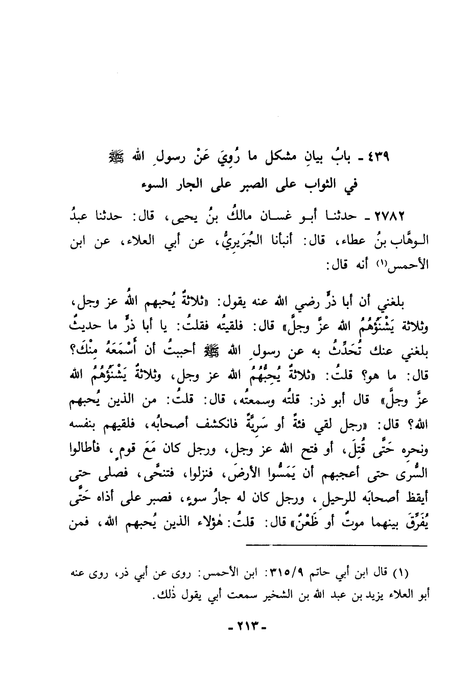 2782 - حَدَّثَنَا أَبُو غَسَّانَ مَالِكُ بْنُ يَحْيَى قَالَ: حَدَّثَنَا عَبْدُ الْوَهَّابِ بْنُ عَطَاءٍ قَالَ: حَدَّثَنَا الْجُرَيْرِيُّ، عَنْ أَبِي الْعَلَاءِ، عَنِ ابْنِ الْأَحْمَسِ أَنَّهُ قَالَ: بَلَغَنِي أَنَّ أَبَا ذَرٍّ رَضِيَ اللهُ عَنْهُ يَقُولُ: " ثَلَاثَةٌ يُحِبُّهُمُ اللهُ عَزَّ وَجَلَّ وَثَلَاثَةٌ يَشْنَؤُهُمُ اللهُ عَزَّ وَجَلَّ قَالَ: فَلَقِيتُهُ , فَقُلْتُ يَا أَبَا ذَرٍّ , مَا حَدِيثٌ بَلَغَنِي عَنْكَ تُحَدِّثُ بِهِ عَنْ رَسُولِ اللهِ صَلَّى اللَّهُ عَلَيْهِ وَسَلَّمَ أَحْبَبْتُ أَنْ أَسْمَعَهُ مِنْكَ؟ قَالَ: مَا هُوَ؟ قُلْتُ: ثَلَاثَةٌ يُحِبُّهُمُ اللهُ عَزَّ وَجَلَّ وَثَلَاثَةٌ يَشْنَؤُهُمُ اللهُ عَزَّ وَجَلَّ قَالَ أَبُو ذَرٍّ: قُلْتُهُ وَسَمِعْتُهُ. قَالَ: قُلْتُ: مَنِ الَّذِينَ يُحِبُّهُمُ اللهُ؟ قَالَ: " رَجُلٌ لَقِيَ فِئَةً أَوْ سَرِيَّةً فَانْكَشَفَ أَصْحَابُهُ فَلَقِيَهُمْ بِنَفْسِهِ وَنَحْرِهِ حَتَّى قُتِلَ أَوْ فَتَحَ اللهُ عَزَّ وَجَلَّ , وَرَجُلٌ كَانَ مَعَ قَوْمٍ , فَأَطَالُوا السُّرَى حَتَّى أَعْجَبَهُمْ أَنْ يَمَسُّوا الْأَرْضَ فَنَزَلُوا , فَتَنَحَّى , فَصَلَّى حَتَّى أَيْقَظَ أَصْحَابَهُ لِلرَّحِيلِ، وَرَجُلٌ كَانَ لَهُ جَارُ سُوءٍ , فَصَبَرَ عَلَى أَذَاهُ حَتَّى يُفَرِّقَ بَيْنَهُمَا مَوْتٌ أَوْ ظَعْنٌ. قَالَ: قُلْتُ: هَؤُلَاءِ الَّذِينَ يُحِبُّهُمُ اللهُ فَمَنِ -[214]- الَّذِينَ يَشْنَؤُهُمُ؟ قَالَ: التَّاجِرُ الْحَلَّافُ أَوِ الْبَائِعُ الْحَلَّافُ شَكَّ الْجُرَيْرِيُّ وَالْبَخِيلُ الْمَنَّانُ , وَالْفَقِيرُ الْمُخْتَالُ "