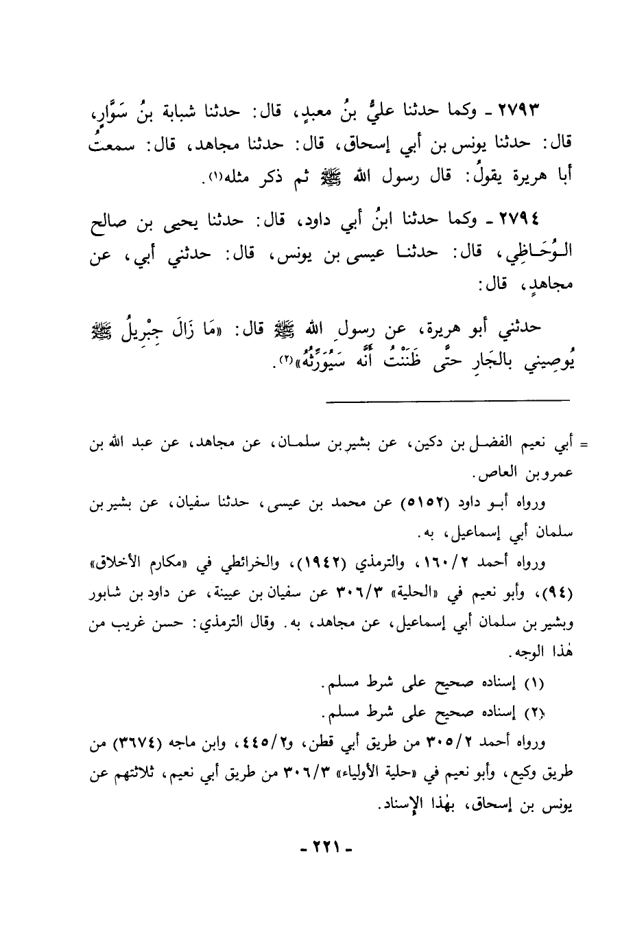 2794 - وَكَمَا حَدَّثَنَا ابْنُ أَبِي دَاوُدَ قَالَ: حَدَّثَنَا يَحْيَى بْنُ صَالِحٍ الْوُحَاظِيُّ قَالَ: حَدَّثَنَا عِيسَى بْنُ يُونُسَ قَالَ: حَدَّثَنِي أَبِي، عَنْ مُجَاهِدٍ قَالَ: حَدَّثَنِي أَبُو هُرَيْرَةَ عَنْ رَسُولِ اللهِ صَلَّى اللَّهُ عَلَيْهِ وَسَلَّمَ قَالَ: " مَا زَالَ جِبْرِيلُ صَلَّى اللَّهُ عَلَيْهِ وَسَلَّمَ يُوصِينِي بِالْجَارِ حَتَّى ظَنَنْتُ أَنَّهُ سَيُوَرِّثُهُ " -[222]- وَقَدْ رُوِيَ عَنْ أَبِي هُرَيْرَةَ رَضِيَ اللهُ عَنْهُ مِنْ طَرِيقٍ آخَرَ