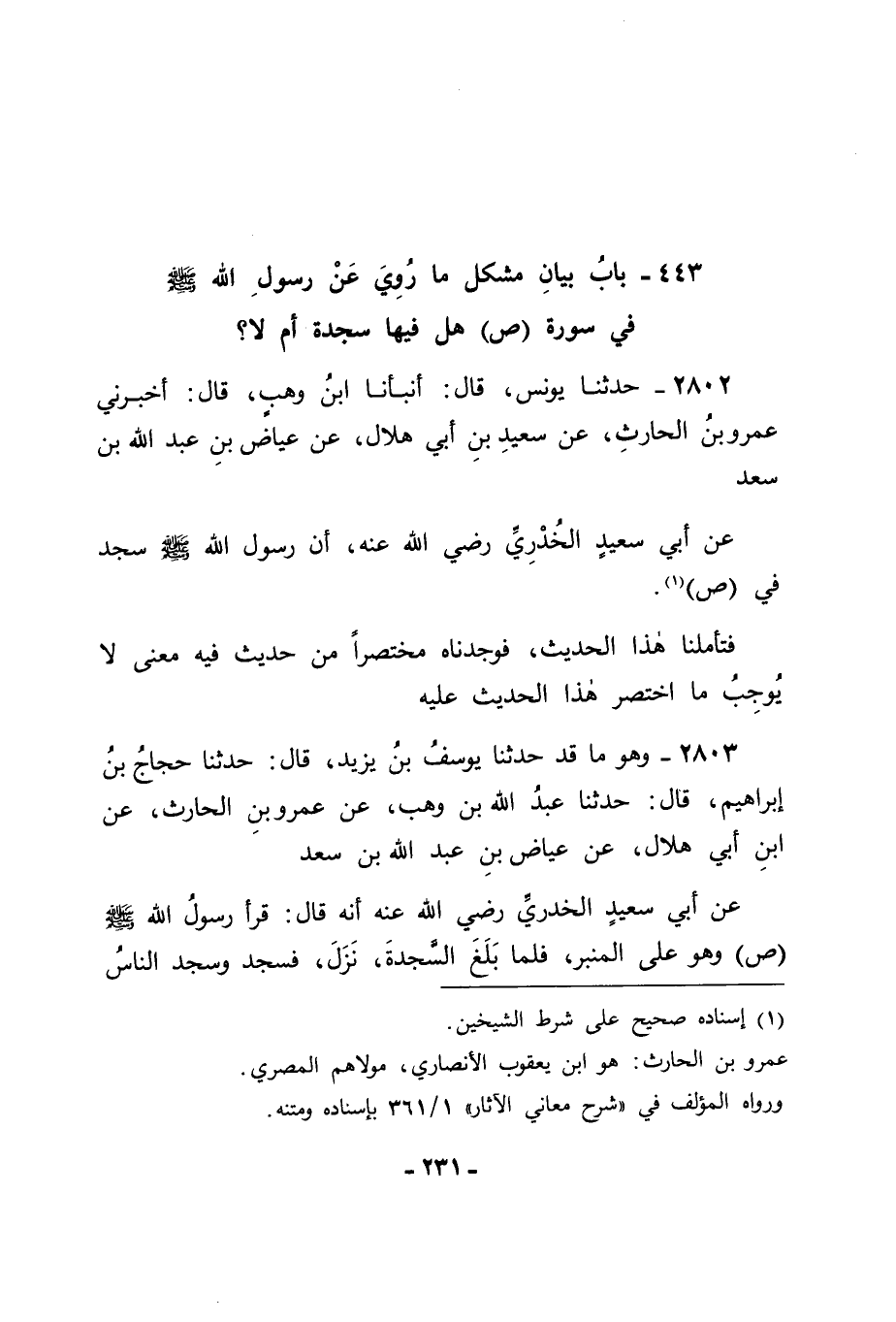 2803 - وَهُوَ مَا قَدْ حَدَّثَنَا يُوسُفُ بْنُ يَزِيدَ قَالَ: حَدَّثَنَا حَجَّاجُ بْنُ إِبْرَاهِيمَ قَالَ: حَدَّثَنَا عَبْدُ اللهِ بْنُ وَهْبٍ، عَنْ عَمْرِو بْنِ الْحَارِثِ، عَنِ ابْنِ أَبِي هِلَالٍ، عَنْ عِيَاضِ بْنِ عَبْدِ اللهِ بْنِ سَعْدٍ، عَنْ أَبِي سَعِيدٍ الْخُدْرِيِّ رَضِيَ اللهُ عَنْهُ أَنَّهُ قَالَ: قَرَأَ رَسُولُ اللهِ صَلَّى اللَّهُ عَلَيْهِ وَسَلَّمَ ص وَهُوَ عَلَى الْمِنْبَرِ فَلَمَّا بَلَغَ السَّجْدَةَ نَزَلَ فَسَجَدَ وَسَجَدَ النَّاسُ -[232]- مَعَهُ فَلَمَّا كَانَ يَوْمٌ آخَرُ قَرَأَهَا , فَلَمَّا بَلَغَ السَّجْدَةَ تَهَيَّئُوا أَوْ كَلِمَةً نَحْوَهَا لِلسُّجُودِ , فَقَالَ رَسُولُ اللهِ صَلَّى اللَّهُ عَلَيْهِ وَسَلَّمَ: " إِنَّمَا هِيَ تَوْبَةُ نَبِيٍّ , وَلَكِنْ رَأَيْتُكُمْ تَهَيَّأْتُمْ أَوْ تَشَزَّنْتُمْ " أَوْ كَلِمَةً نَحْوَهَا لِلسُّجُودِ فَنَزَلَ وَسَجَدُوا فَكَانَ فِي هَذَا الْحَدِيثِ إِخْبَارُ أَبِي سَعِيدٍ أَنَّ رَسُولَ اللهِ صَلَّى اللَّهُ عَلَيْهِ وَسَلَّمَ سَجَدَ فِيهَا عِنْدَ تِلَاوَتِهِ إِيَّاهَا فِي الْبَدْءِ , ثُمَّ تَلَاهَا بَعْدَ ذَلِكَ , فَتَهَيَّأَ النَّاسُ لِلسُّجُودِ فِيهَا مَعَ سُجُودِهِ فِيهَا , فَأَخْبَرَهُمْ أَنَّهَا سَجْدَةُ شُكْرٍ مِنْ نَبِيٍّ عِنْدَ تَوْبَةِ اللهِ عَلَيْهِ أَيْ أَنَّهَا لَيْسَتْ مِنْ عَزَائِمِ السُّجُودِ , وَإِنَّهَا إِنَّمَا هِيَ لِمَعْنًى كَانَ إِلَى ذَلِكَ النَّبِيِّ دُونَهُمْ. وَعَقَلْنَا بِذَلِكَ أَنَّهُ إِذَا كَانَ مِنَ اللهِ عَزَّ وَجَلَّ إِلَى أَحَدِهِمْ مَا هُوَ مِنْ جِنْسِ ذَلِكَ كَانَ مُبَاحًا لَهُ السُّجُودُ عِنْدَهُ , وَفِي ذَلِكَ مَا قَدْ دَلَّ عَلَى إِبَاحَةِ السُّجُودِ لِلشُّكْرِ كَمَا كَانَ مُحَمَّدُ بْنُ الْحَسَنِ، وَالشَّافِعِيُّ يَقُولَانِهِ فِي ذَلِكَ. وَفِي ذَلِكَ مَا قَدْ دَلَّ أَنَّ مِنَ السُّجُودِ مَا هُوَ عَزِيمَةٌ لَا بُدَّ مِنَ السُّجُودِ , وَأَنَّ مِنْهَا مَا هُوَ لَيْسَ كَذَلِكَ. فَالْتَمَسْنَا ذَلِكَ هَلْ نَجِدُهُ فِي شَيْءٍ مِمَّا يُرْوَى عَنْ رَسُولِ اللهِ صَلَّى اللَّهُ عَلَيْهِ وَسَلَّمَ أَوْ عَنْ أَحَدٍ مِنْ أَصْحَابِهِ رَضْوَانَ اللهِ عَلَيْهِمْ