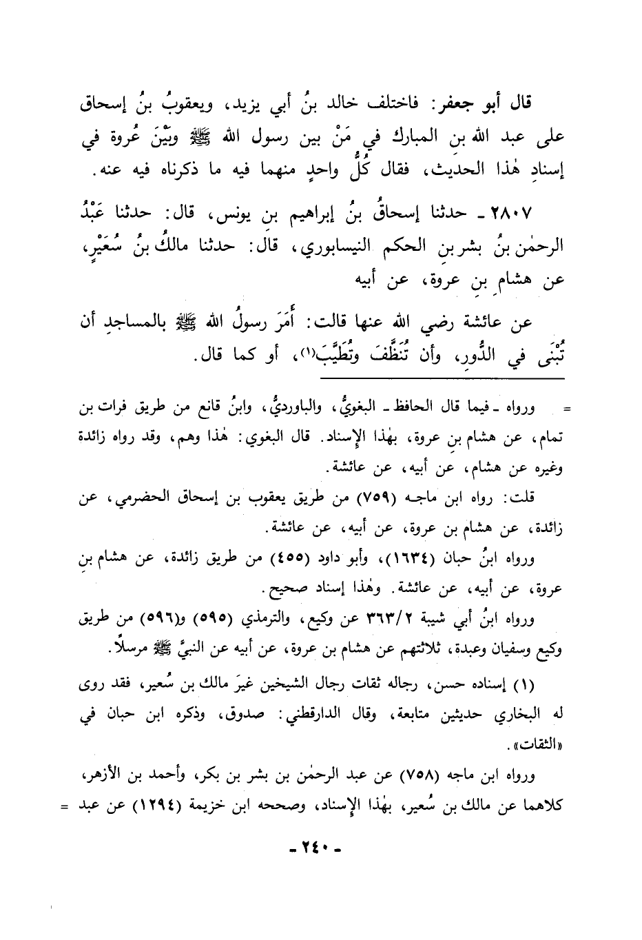 2807 - حَدَّثَنَا إِسْحَاقُ بْنُ إِبْرَاهِيمَ بْنِ يُونُسَ قَالَ: حَدَّثَنَا عَبْدُ الرَّحْمَنِ بْنُ بِشْرِ بْنِ الْحَكَمِ النَّيْسَابُورِيُّ قَالَ: حَدَّثَنَا مَالِكُ بْنُ سُعَيْرٍ، عَنْ هِشَامِ بْنِ عُرْوَةَ، عَنْ أَبِيهِ، عَنْ عَائِشَةَ رَضِيَ اللهُ عَنْهَا قَالَتْ: أَمَرَ رَسُولُ اللهِ صَلَّى اللَّهُ عَلَيْهِ وَسَلَّمَ بِالْمَسَاجِدِ أَنْ تُبْنَى فِي الدُّورِ , وَأَنْ تُنَظَّفَ وَتُطَيَّبَ أَوْ كَمَا قَالَ -[241]- وَاحْتَجَّ بَعْضُ مَنْ يَذْهَبُ إِلَى أَنَّ الرَّجُلَ إِذَا بَنَى فِي دَارِهِ مَسْجِدًا وَخَلَّى بَيْنَ النَّاسِ وَبَيْنَهُ حَتَّى صَلُّوا فِيهِ أَنَّهُ يَكُونُ بِذَلِكَ كَسَائِرِ الْمَسَاجِدِ , وَأَنَّهُ يَزُولُ مِلْكُهُ عَنْهُ بِذَلِكَ عَلَى مَنْ يُخَالِفُ ذَلِكَ وَيَقُولُ فِيهِ: إِنَّهُ لَا يَكُونُ مَسْجِدًا , وَلَا يَخْرُجُ بِذَلِكَ مِنْ مِلْكِهِ إِذْ كَانَ فِي دَارٍ يُغْلِقُ بَابَهَا عَلَيْهِ وَيَحُولُ بَيْنَ النَّاسِ وَبَيْنَهُ فِي حَالٍ مَا , وَذَلِكَ مِنْ حُقُوقِهِ بِحَقِّ مِلْكِهِ لِبَقِيَّةِ الدَّارِ الَّتِي أَحْدَثَهُ وَمِمَّنْ كَانَ يَقُولُ ذَلِكَ أَبُو حَنِيفَةَ رَحِمَهُ اللهُ وَأَصْحَابُهُ رَحِمَهُمُ اللهُ. فَتَأَمَّلْنَا نَحْنُ هَذَا الْحَدِيثَ هَلْ يَدُلُّ عَلَى شَيْءٍ مِمَّا ذَكَرَهُ هَذَا الْمُحْتَجُّ بِهِ فِيمَا ذَكَرْنَا أَمْ لَا. فَوَجَدْنَا أَمْرَهُ صَلَّى اللَّهُ عَلَيْهِ وَسَلَّمَ بِاتِّخَاذِ الْمَسَاجِدِ فِي الدُّورِ قَدْ يَحْتَمِلُ أَنْ يَكُونَ أَرَادَ بِهِ الْمَوَاضِعَ الَّتِي فِيهَا الدُّورُ لَا الدُّورَ الَّتِي تُغْلَقُ عَلَيْهَا الْأَبْوَابُ , فَيَكُونُ ذَلِكَ الِاتِّخَاذُ لِتِلْكَ الْمَسَاجِدِ فِي خِلَالِ الدُّورِ الَّتِي يُبْنَى فِيهَا وَفِي أَفْنِيَتِهَا لَا دَاخِلَ شَيْءٍ مِنْهَا مِمَّا يُغْلِقُ عَلَيْهِ أَبْوَابَهَا ; لِأَنَّ مَا جَمَعَ الدُّورَ مِنَ الْمَوَاضِعِ يُسَمَّى بِجُمْلَتِهِ دُورًا إِذْ كَانَتِ الدُّورُ لَا تَتَهَيَّأُ سُكْنَاهَا إِلَّا بِهِ كَمَا سَمَّى اللهُ تَعَالَى الْبَلْدَةَ الَّتِي ذَكَرَهَا فِي كِتَابِهِ أَنَّهَا دَارُ الْفَاسِقِينَ بِدَارِ الْفَاسِقِينَ , فَقَالَ عَزَّ وَجَلَّ: {سَأُرِيكُمْ دَارَ الْفَاسِقِينَ} [الأعراف: 145] وَفِيهَا الطُّرُقَاتُ وَمَا سِوَاهَا مِمَّا لَا يَكُونُ الْبُلْدَانُ إِلَّا بِهِ. وَمِثْلُ ذَلِكَ قَوْلُهُ عَزَّ وَجَلَّ فِي الْوَعِيدِ لِقَوْمِ نَبِيِّهِ صَالِحٍ صَلَّى اللَّهُ عَلَيْهِ وَسَلَّمَ {تَمَتَّعُوا -[242]- فِي دَارِكُمْ ثَلَاثَةَ أَيَّامٍ} [هود: 65] , ثُمَّ قَالَ بَعْدَ ذَلِكَ: {فَأَخَذَتْهُمُ الرَّجْفَةُ فَأَصْبَحُوا فِي دَارِهِمْ جَاثِمِينَ} [الأعراف: 78] وَمِنْ ذَلِكَ قَوْلُهُ عَزَّ وَجَلَّ فِي الْمَوْضِعِ الَّذِي ذَكَرَ فِيهِ الصَّيْحَةَ فِيمَنْ ذَكَرَهَا فِيهِ: {وَأَخَذَتِ الَّذِينَ ظَلَمُوا الصَّيْحَةُ فَأَصْبَحُوا فِي دِيَارِهِمْ جَاثِمِينَ} [هود: 94] فَذَكَرَ عَزَّ وَجَلَّ مَوَاضِعَهُمْ بِالدِّيَارِ وَذَكَرَ أَنَّهَا دَارٌ فَدَلَّ ذَلِكَ أَنَّ الْبَلَدَ قَدْ تُسَمَّى دَارًا , وَأَنَّهَا قَدْ تُسَمَّى دُورًا، وَمِنْ ذَلِكَ مَا قَدْ رُوِيَ عَنْ رَسُولِ اللهِ صَلَّى اللَّهُ عَلَيْهِ وَسَلَّمَ فِي هَذَا الْمَعْنَى