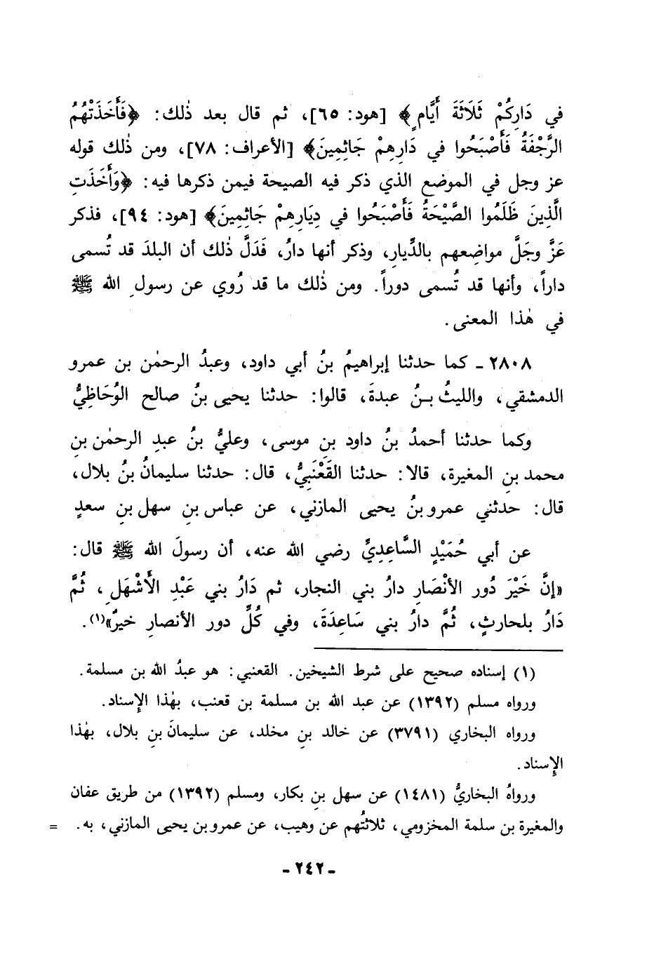 2808 - كَمَا حَدَّثَنَا إِبْرَاهِيمُ بْنُ أَبِي دَاوُدَ، وَعَبْدُ الرَّحْمَنِ بْنُ عَمْرٍو الدِّمَشْقِيُّ، وَاللَّيْثُ بْنُ عَبْدَةَ قَالُوا حَدَّثَنَا يَحْيَى بْنُ صَالِحٍ الْوُحَاظِيُّ، وَكَمَا حَدَّثَنَا أَحْمَدُ بْنُ دَاوُدَ بْنِ مُوسَى، وَعَلِيُّ بْنُ عَبْدِ الرَّحْمَنِ بْنِ مُحَمَّدِ بْنِ الْمُغِيرَةِ قَالَا: حَدَّثَنَا الْقَعْنَبِيُّ قَالَا: حَدَّثَنَا سُلَيْمَانُ بْنُ بِلَالٍ قَالَ: حَدَّثَنِي عَمْرُو بْنُ يَحْيَى الْمَازِنِيُّ، عَنْ عَبَّاسِ بْنِ سَهْلِ بْنِ سَعْدٍ، عَنْ أَبِي حُمَيْدٍ السَّاعِدِيِّ رَضِيَ اللهُ عَنْهُ أَنَّ رَسُولَ اللهِ صَلَّى اللَّهُ عَلَيْهِ وَسَلَّمَ قَالَ: " إِنَّ خَيْرَ دُورِ الْأَنْصَارِ دَارُ بَنِي النَّجَّارِ , ثُمَّ دَارُ بَنِي عَبْدِ الْأَشْهَلِ , ثُمَّ دَارُ بَلْحَارِثِ , ثُمَّ دَارُ بَنِي سَاعِدَةَ وَفِي كُلِّ دُورِ الْأَنْصَارِ خَيْرٌ " -[243]-