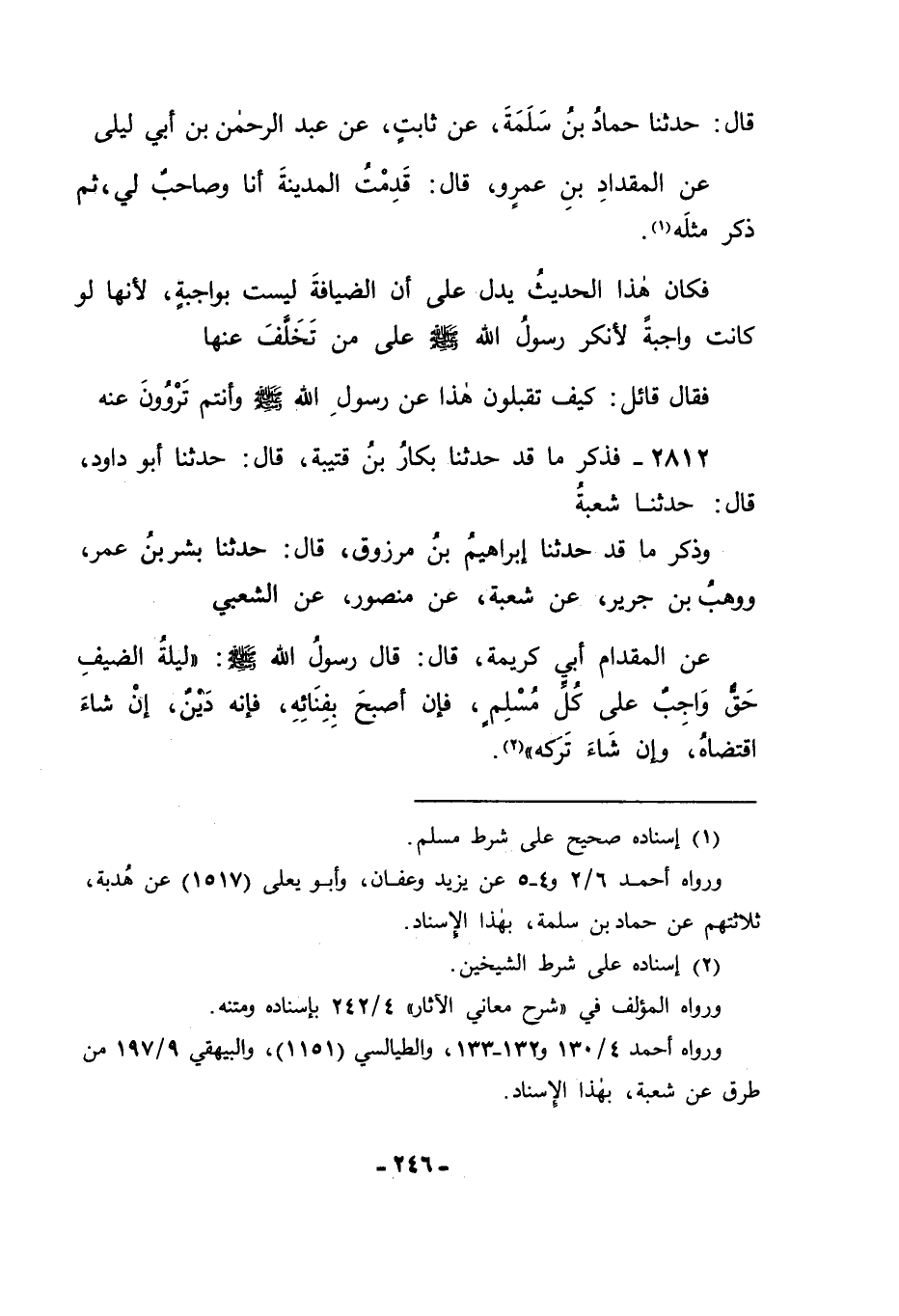 2812 - فَذَكَرَ مَا قَدْ حَدَّثَنَا بَكَّارُ بْنُ قُتَيْبَةَ قَالَ: حَدَّثَنَا أَبُو دَاوُدَ قَالَ: حَدَّثَنَا شُعْبَةُ، وَذَكَرَ مَا قَدْ حَدَّثَنَا إِبْرَاهِيمُ بْنُ مَرْزُوقٍ قَالَ: حَدَّثَنَا بِشْرُ بْنُ عُمَرَ، وَوَهْبُ بْنُ جَرِيرٍ، عَنْ شُعْبَةَ، عَنْ مَنْصُورٍ، عَنِ الشَّعْبِيِّ، عَنِ الْمِقْدَامِ أَبِي كَرِيمَةَ قَالَ: قَالَ رَسُولُ اللهِ صَلَّى اللَّهُ عَلَيْهِ وَسَلَّمَ: " لَيْلَةُ الضَّيْفِ حَقٌّ وَاجِبٌ عَلَى كُلِّ مُسْلِمٍ , فَإِنْ أَصْبَحَ بِفِنَائِهِ فَإِنَّهُ دَيْنٌ إِنْ شَاءَ اقْتَضَاهُ , وَإِنْ شَاءَ تَرَكَهُ " -[247]-