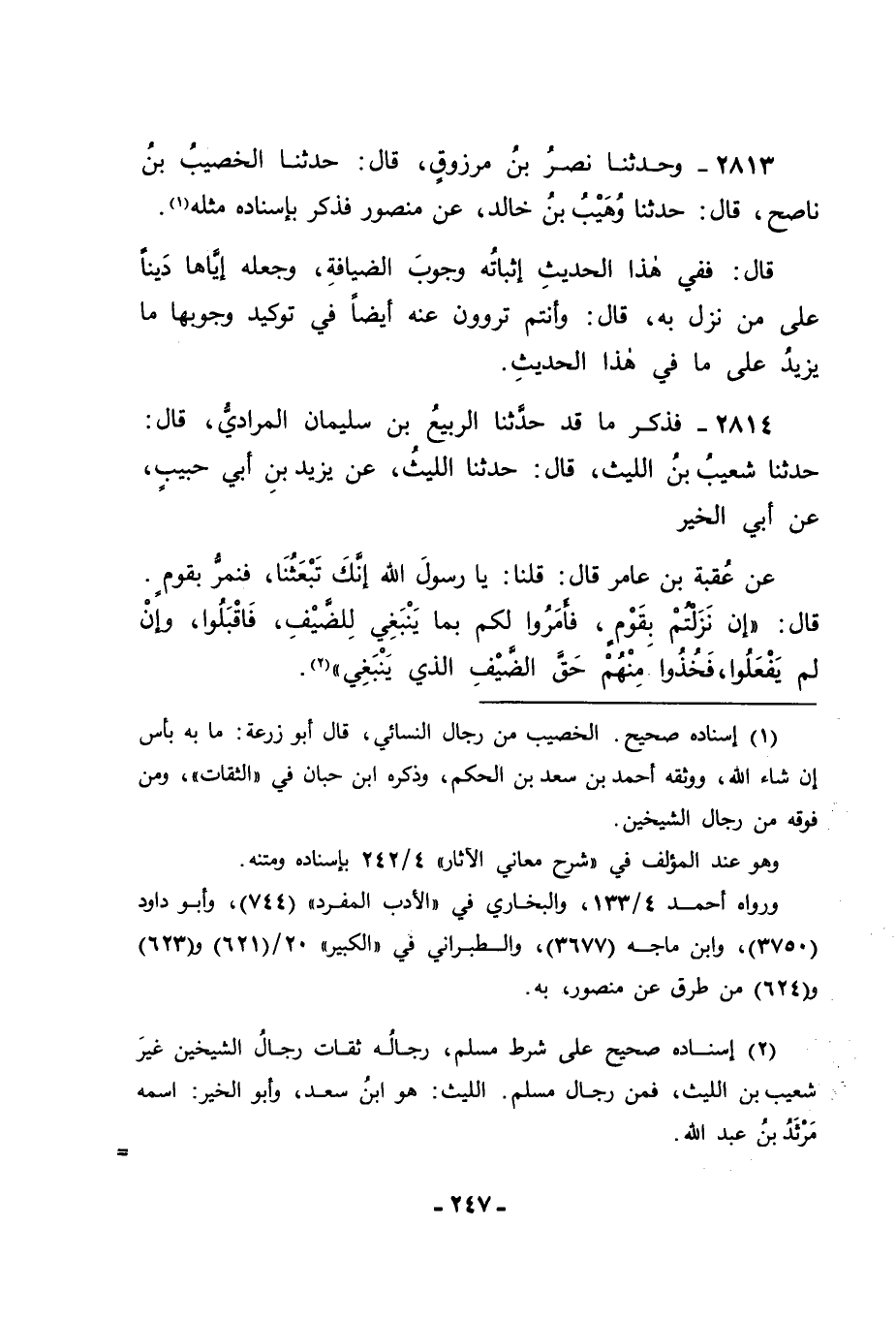 2814 - فَذَكَرَ مَا قَدْ حَدَّثَنَا الرَّبِيعُ بْنُ سُلَيْمَانَ الْمُرَادِيُّ قَالَ: حَدَّثَنَا شُعَيْبُ بْنُ اللَّيْثِ قَالَ: حَدَّثَنَا اللَّيْثُ، عَنْ يَزِيدَ بْنِ أَبِي حَبِيبٍ، عَنْ أَبِي الْخَيْرِ، عَنْ عُقْبَةَ بْنِ عَامِرٍ قَالَ: قُلْنَا يَا رَسُولَ اللهِ , إِنَّكَ تَبْعَثُنَا فَنَمُرُّ بِقَوْمٍ قَالَ: " إِنْ نَزَلْتُمْ بِقَوْمٍ فَأَمَرُوا لَكُمْ بِمَا يَنْبَغِي لِلضَّيْفِ فَاقْبَلُوا , وَإِنْ لَمْ يَفْعَلُوا فَخُذُوا مِنْهُمْ حَقَّ الضَّيْفِ الَّذِي يَنْبَغِي "