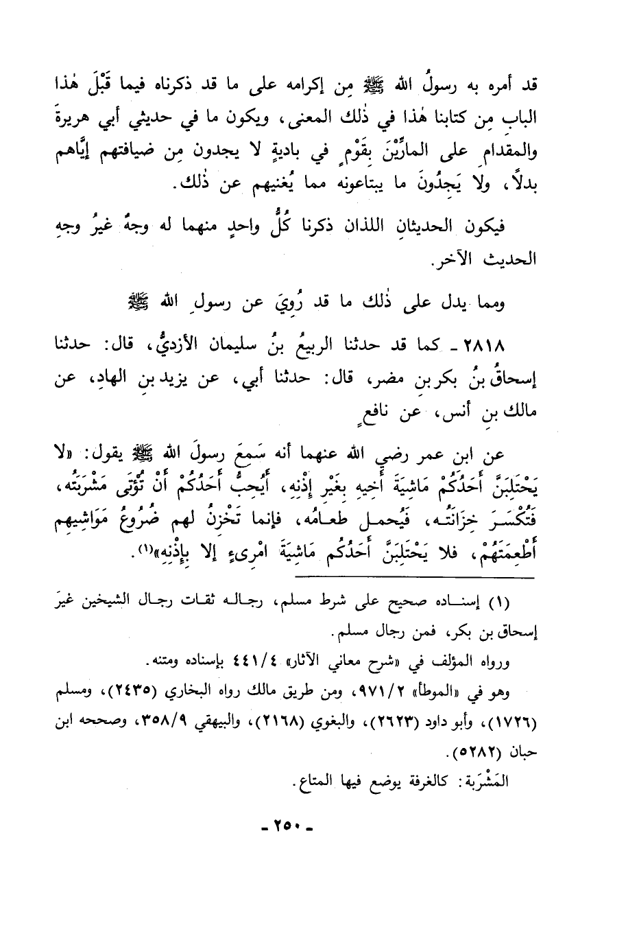2818 - كَمَا قَدْ حَدَّثَنَا الرَّبِيعُ بْنُ سُلَيْمَانَ الْأَزْدِيُّ قَالَ: حَدَّثَنَا إِسْحَاقُ بْنُ بَكْرِ بْنِ مُضَرَ قَالَ: حَدَّثَنَا أَبِي، عَنْ يَزِيدَ بْنِ الْهَادِ، عَنْ مَالِكِ بْنِ أَنَسٍ، عَنْ نَافِعٍ، عَنِ ابْنِ عُمَرَ رَضِيَ اللهُ عَنْهُمَا أَنَّهُ سَمِعَ رَسُولَ اللهِ صَلَّى اللَّهُ عَلَيْهِ وَسَلَّمَ يَقُولُ: " لَا يَحْتَلِبَنَّ أَحَدُكُمْ مَاشِيَةَ أَخِيهِ بِغَيْرِ إِذْنِهِ , أَيُحِبُّ أَحَدُكُمْ أَنْ تُؤْتَى مَشْرَبَتُهُ فَتُكْسَرَ خِزَانَتُهُ فَيُحْمَلَ طَعَامُهُ , فَإِنَّمَا تَخْزُنُ لَهُمْ ضُرُوعُ مَوَاشِيهِمْ أَطْعِمَتَهُمْ فَلَا يَحْتَلِبَنَّ أَحَدُكُمْ مَاشِيَةَ امْرِئٍ إِلَّا بِإِذْنِهِ " -[251]-