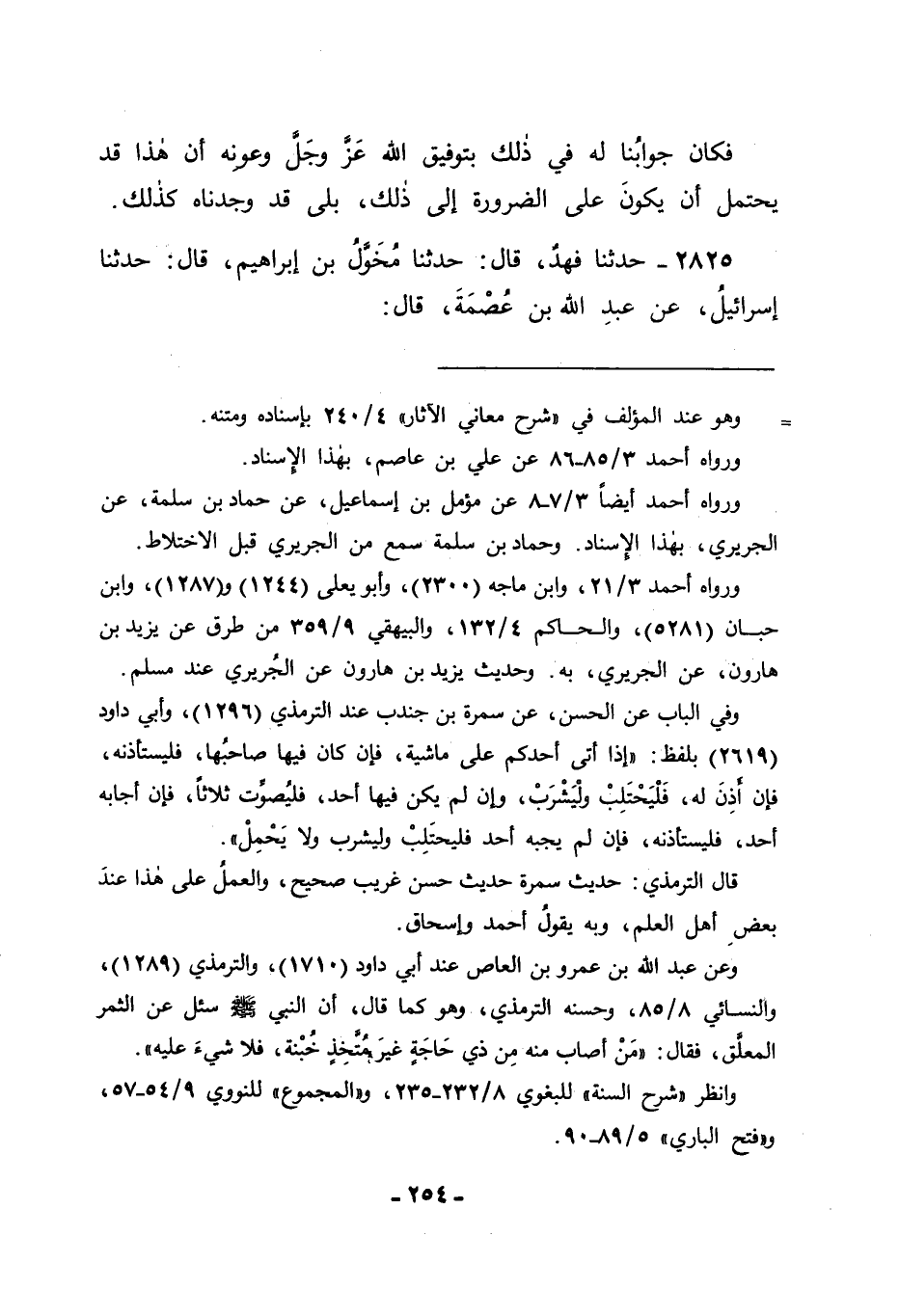 2825 - حَدَّثَنَا فَهْدٌ قَالَ: حَدَّثَنَا مُخَوَّلُ بْنُ إِبْرَاهِيمَ قَالَ: حَدَّثَنَا إِسْرَائِيلُ، عَنْ عَبْدِ اللهِ بْنِ عُصْمَةَ قَالَ: -[255]- سَمِعْتُ أَبَا سَعِيدٍ الْخُدْرِيَّ يَقُولُ: " إِذَا أَرْمَلَ الْقَوْمُ , فَصَبَّحُوا الْإِبِلَ فَلْيُنَادُوا الرَّاعِيَ ثَلَاثًا، فَإِنْ لَمْ يَجِدُوا الرَّاعِيَ وَوَجَدُوا الْإِبِلَ فَلْيَنْضَحُوا لَبَنَ الرَّاوِيَةِ إِنْ كَانَ فِي الْإِبِلِ رَاوِيَةٌ , وَلَا حَقَّ لَهُمْ فِي نَفْسِهَا , فَإِنْ جَاءَ الرَّاعِي فَلْيُمْسِكْهُ رَجُلَانِ وَلَا يُقَاتِلُوهُ وَلْيَشْرَبُوا , فَإِنْ كَانَ مَعَهُمْ دَرَاهِمُ فَهُوَ عَلَيْهِمْ حَرَامٌ إِلَّا بِإِذْنِ أَهْلِهَا " قَالَ: فَهَذَا مَوْقُوفٌ عَلَى أَبِي سَعِيدٍ فَكَانَ جَوَابُنَا لَهُ فِي ذَلِكَ بِتَوْفِيقِ اللهِ عَزَّ وَجَلَّ وَعَوْنِهِ أَنَّ الْحَدِيثَ الَّذِي احْتَجَّ بِهِ عَلَيْنَا مَشْكُوكٌ فِيهِ هَلْ هُوَ مَرْفُوعٌ إِلَى النَّبِيِّ صَلَّى اللَّهُ عَلَيْهِ وَسَلَّمَ أَوْ مَوْقُوفٌ عَلَى أَبِي سَعِيدٍ؟ وَقَدْ وَجَدْنَا حَدِيثَ ابْنِ عُصْمَةَ هَذَا مَرْفُوعًا فِي رِوَايَةِ شَرِيكٍ إِيَّاهُ