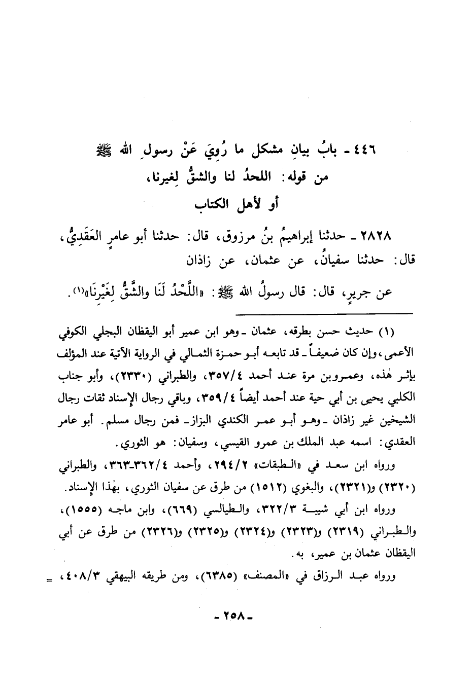 2828 - حَدَّثَنَا إِبْرَاهِيمُ بْنُ مَرْزُوقٍ قَالَ: حَدَّثَنَا أَبُو عَامِرٍ الْعَقَدِيُّ قَالَ: حَدَّثَنَا سُفْيَانُ، عَنْ عُثْمَانَ، عَنْ زَاذَانَ، عَنْ جَرِيرٍ قَالَ: قَالَ رَسُولُ اللهِ صَلَّى اللَّهُ عَلَيْهِ وَسَلَّمَ: " اللَّحْدُ لَنَا وَالشَّقُّ لِغَيْرِنَا "