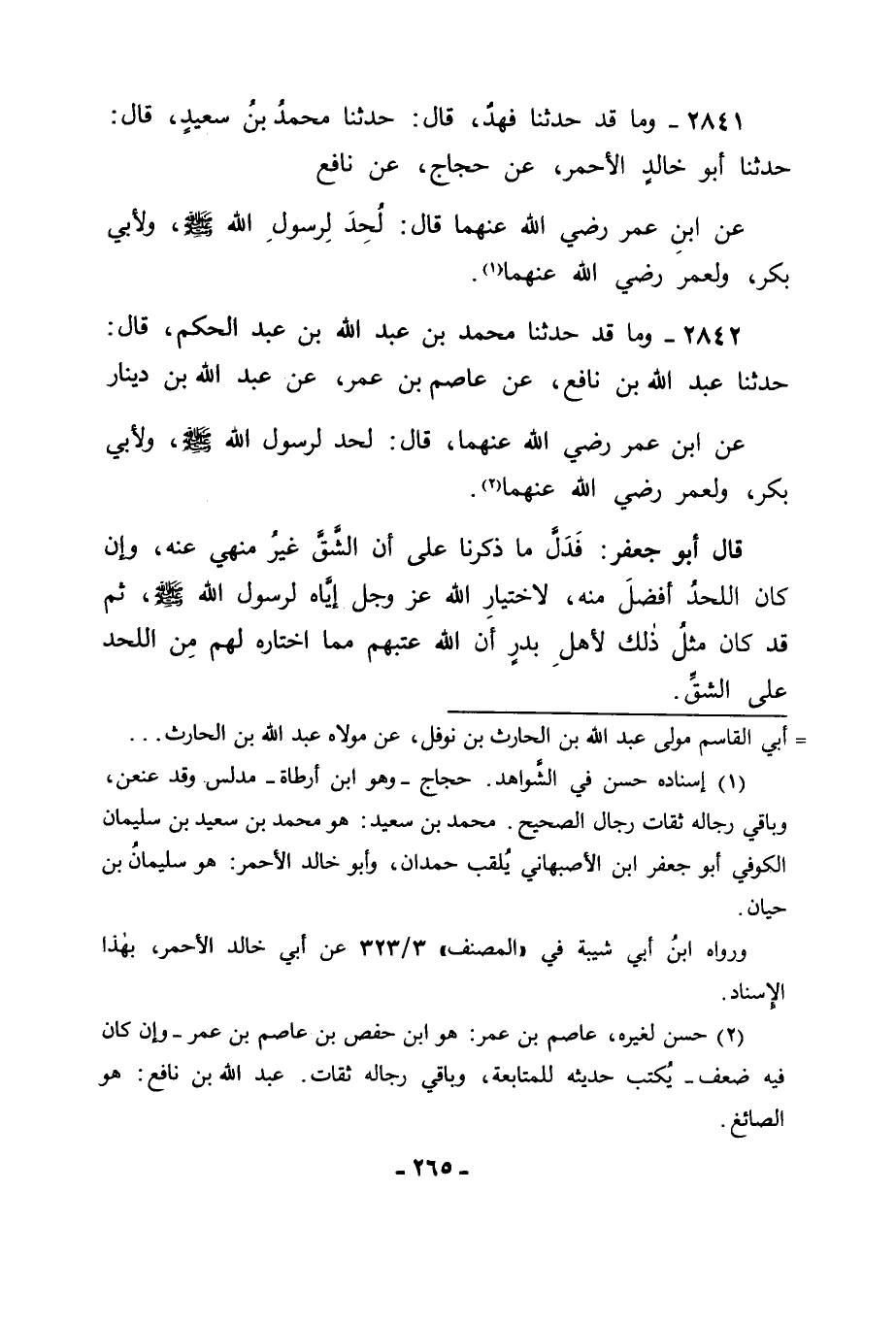 2842 - وَمَا قَدْ حَدَّثَنَا مُحَمَّدُ بْنُ عَبْدِ اللهِ بْنِ عَبْدِ الْحَكَمِ قَالَ: حَدَّثَنَا عَبْدُ اللهِ بْنُ نَافِعٍ، عَنْ عَاصِمِ بْنِ عُمَرَ، عَنْ عَبْدِ اللهِ بْنِ دِينَارٍ، عَنِ ابْنِ عُمَرَ رَضِيَ اللهُ عَنْهُمَا قَالَ: " لُحِدَ لِرَسُولِ اللهِ صَلَّى اللَّهُ عَلَيْهِ وَسَلَّمَ , وَلِأَبِي بَكْرٍ، وَلِعُمَرَ رَضِيَ اللهُ عَنْهُمَا " قَالَ أَبُو جَعْفَرٍ: فَدَلَّ مَا ذَكَرْنَا عَلَى أَنَّ الشَّقَّ غَيْرُ مَنْهِيٍّ عَنْهُ , وَإِنْ كَانَ اللَّحْدُ أَفْضَلَ مِنْهُ لِاخْتِيَارِ اللهِ عَزَّ وَجَلَّ إِيَّاهُ لِرَسُولِ اللهِ صَلَّى اللَّهُ عَلَيْهِ وَسَلَّمَ , ثُمَّ قَدْ كَانَ مِثْلُ ذَلِكَ لِأَهْلِ بَدْرٍ أَنَّ اللهَ عَتَبَهُمْ مِمَّا اخْتَارَهُ لَهُمْ مِنَ اللَّحْدِ عَلَى الشَّقِّ
