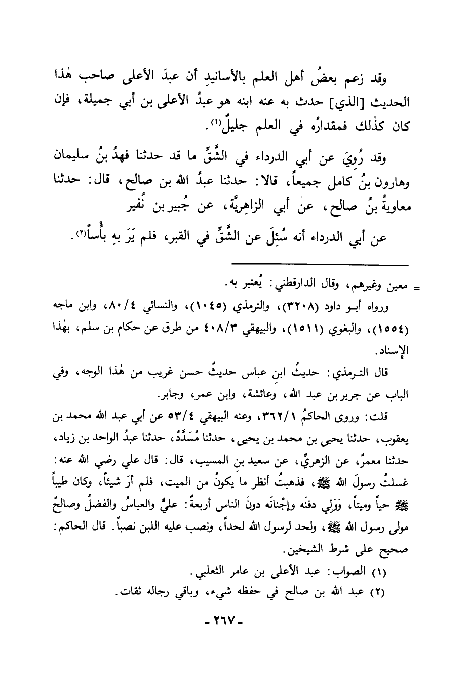 مَا قَدْ حَدَّثَنَا فَهْدُ بْنُ سُلَيْمَانَ، وَهَارُونُ بْنُ كَامِلٍ جَمِيعًا قَالَا: حَدَّثَنَا عَبْدُ اللهِ بْنُ صَالِحٍ قَالَ: حَدَّثَنَا مُعَاوِيَةُ بْنُ صَالِحٍ، عَنْ أَبِي الزَّاهِرِيَّةِ عَنْ جُبَيْرِ بْنِ نُفَيْرٍ عَنْ أَبِي الدَّرْدَاءِ أَنَّهُ: سُئِلَ عَنِ الشَّقِّ فِي الْقَبْرِ فَلَمْ يَرَ بِهِ بَأْسًا -[268]- فَفِيمَا قَدْ رَوَيْنَاهُ عَنْ أَبِي الدَّرْدَاءِ فِي هَذَا مَا قَدْ وَافَقَ مَا ذَهَبْنَا إِلَيْهِ فِي هَذَا الْبَابِ مِنَ الشَّقِّ فِي هَذَا الْحَدِيثِ مِنْ إِبَاحَتِهِ , وَإِنْ كَانَ اللَّحْدُ أَفْضَلَ مِنْهُ , وَاللهَ نَسْأَلُهُ التَّوْفِيقَ