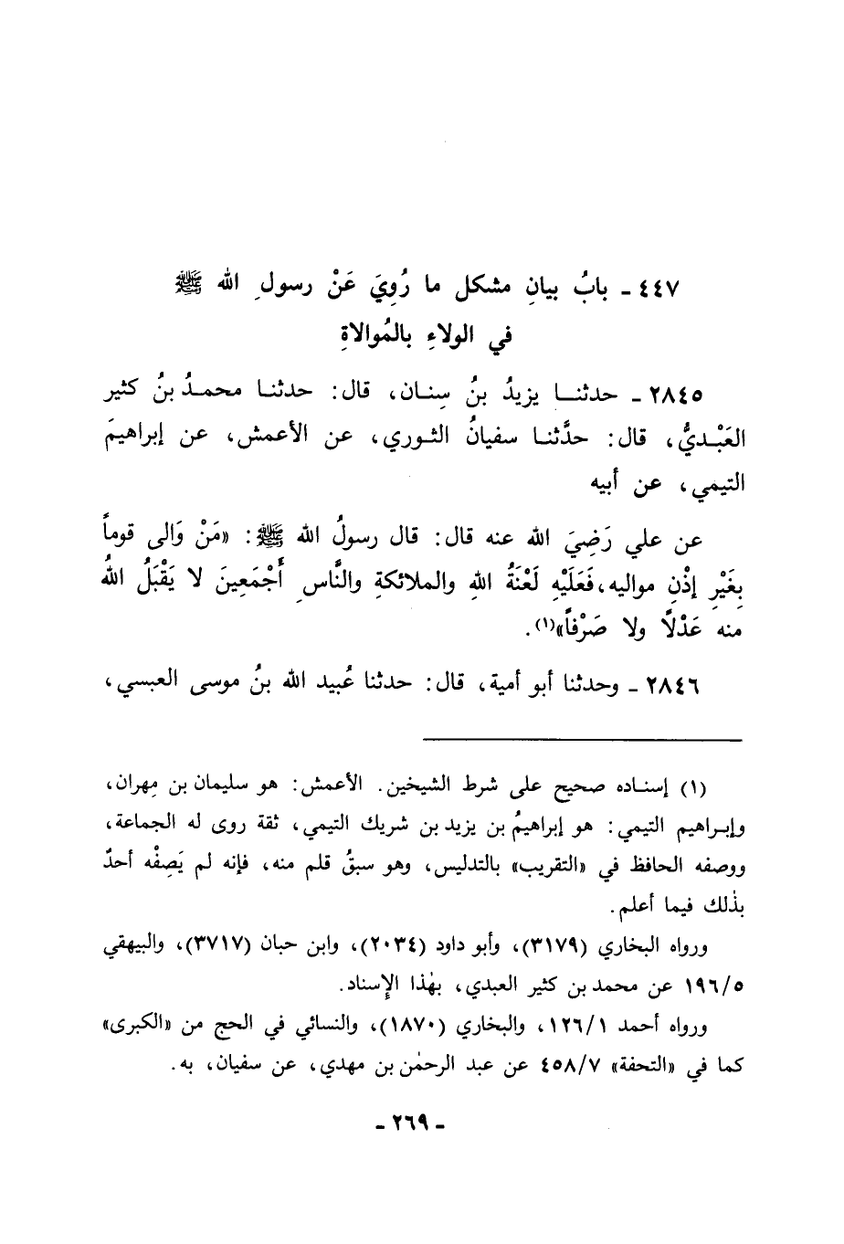 2845 - حَدَّثَنَا يَزِيدُ بْنُ سِنَانٍ قَالَ: حَدَّثَنَا مُحَمَّدُ بْنُ كَثِيرٍ الْعَبْدِيُّ قَالَ: حَدَّثَنَا سُفْيَانُ الثَّوْرِيُّ، عَنِ الْأَعْمَشِ، عَنْ إِبْرَاهِيمَ التَّيْمِيِّ، عَنْ أَبِيهِ، عَنْ عَلِيٍّ رَضِيَ اللهُ عَنْهُ قَالَ: قَالَ رَسُولُ اللهِ صَلَّى اللَّهُ عَلَيْهِ وَسَلَّمَ: " مَنْ وَالَى قَوْمًا بِغَيْرِ إِذْنِ مَوَالِيهِ فَعَلَيْهِ لَعْنَةُ اللهِ وَالْمَلَائِكَةِ وَالنَّاسِ أَجْمَعِينَ لَا يَقْبَلُ اللهُ مِنْهُ عَدْلًا وَلَا صَرْفًا "