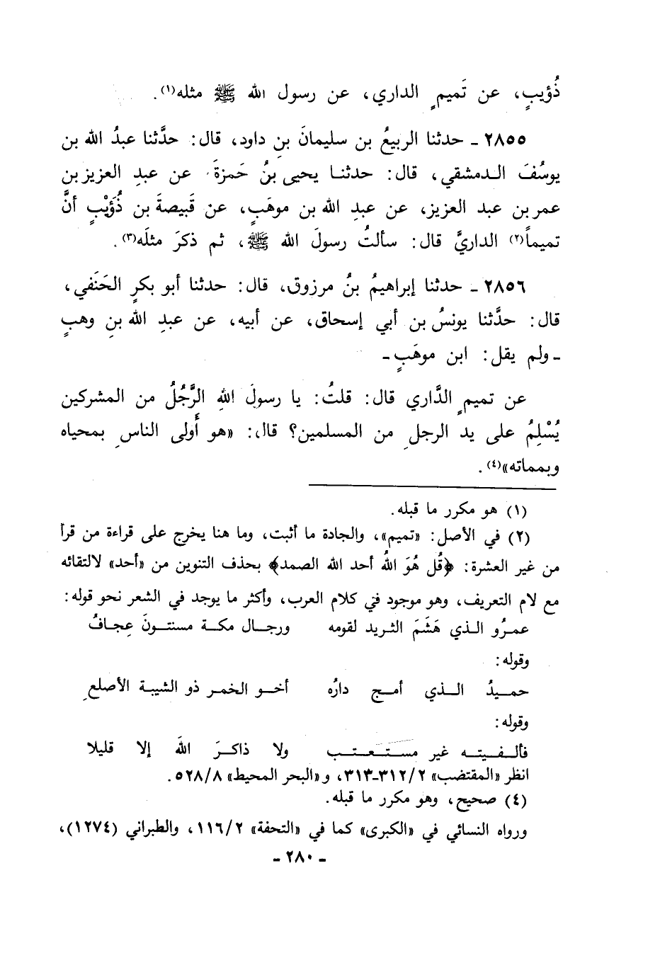 2856 - حَدَّثَنَا إِبْرَاهِيمُ بْنُ مَرْزُوقٍ قَالَ: حَدَّثَنَا أَبُو بَكْرٍ الْحَنَفِيُّ قَالَ: حَدَّثَنَا يُونُسُ بْنُ أَبِي إِسْحَاقَ، عَنْ أَبِيهِ، عَنْ عَبْدِ اللهِ بْنِ وَهْبٍ، وَلَمْ يَقُلْ ابْنَ مَوْهِبٍ عَنْ تَمِيمٍ الدَّارِيِّ قَالَ: قُلْتُ يَا رَسُولَ اللهِ , الرَّجُلُ مِنَ الْمُشْرِكِينَ يُسْلِمُ عَلَى يَدِ الرَّجُلِ مِنَ الْمُسْلِمِينَ؟ قَالَ: " هُوَ أَوْلَى النَّاسِ بِمَحْيَاهُ وَبِمَمَاتِهِ " -[281]- قَالَ: فَكَانَ فِيمَا رَوَيْنَاهُ مِنْ حَدِيثِ تَمِيمٍ هَذَا إِثْبَاتُ رَسُولِ اللهِ صَلَّى اللَّهُ عَلَيْهِ وَسَلَّمَ أَنَّ إِسْلَامَ الرَّجُلِ عَلَى يَدَيِ الرَّجُلِ يُوجِبُ لَهُ أَنَّهُ أَوْلَى النَّاسِ بِمَحْيَاهُ وَبِمَمَاتِهِ , فَتَعَلَّقَ قَوْمٌ بِهَذَا الْحَدِيثِ , فَأَثْبَتُوا بِهِ الْوَلَاءَ لِلَّذِي كَانَ الْإِسْلَامُ عَلَى يَدِهِ مِنَ الَّذِي أَسْلَمَ عَلَى يَدِهِ وَجَعَلُوهُ بِهِ مَوْلَاهُ وَوَرَّثُوهُ مِنْهُ , مِنْهُمْ عُمَرُ بْنُ عَبْدِ الْعَزِيزِ