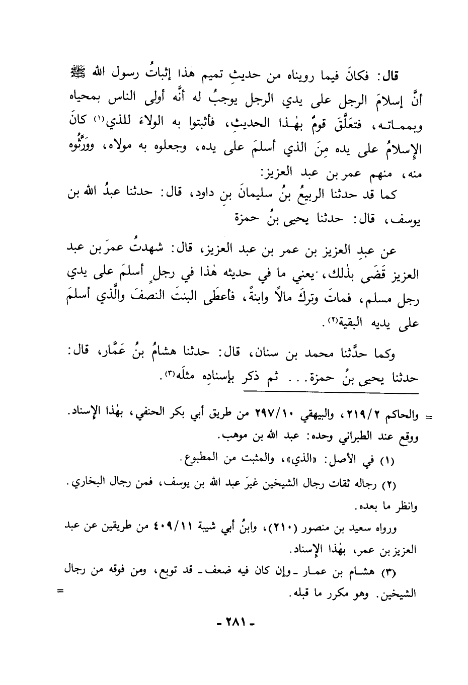 كَمَا قَدْ حَدَّثَنَا الرَّبِيعُ بْنُ سُلَيْمَانَ بْنِ دَاوُدَ قَالَ: حَدَّثَنَا عَبْدُ اللهِ بْنُ يُوسُفَ قَالَ: حَدَّثَنَا يَحْيَى بْنُ حَمْزَةَ عَنْ عَبْدِ الْعَزِيزِ بْنِ عُمَرَ بْنِ عَبْدِ الْعَزِيزِ قَالَ: شَهِدْتُ عُمَرَ بْنَ عَبْدِ الْعَزِيزِ قَضَى بِذَلِكَ يَعْنِي مَا فِي حَدِيثِهِ هَذَا فِي رَجُلٍ أَسْلَمَ عَلَى يَدَيْ رَجُلٍ مُسْلِمٍ , فَمَاتَ وَتَرَكَ مَالًا وَابْنَةً , فَأَعْطَى الْبِنْتَ النِّصْفَ , وَالَّذِي أَسْلَمَ عَلَى يَدَيْهِ الْبَقِيَّةَ وَكَمَا حَدَّثَنَا مُحَمَّدُ بْنُ سِنَانٍ قَالَ: حَدَّثَنَا هِشَامُ بْنُ عَمَّارٍ قَالَ: حَدَّثَنَا يَحْيَى بْنُ حَمْزَةَ , ثُمَّ ذَكَرَ بِإِسْنَادِهِ مِثْلَهُ -[282]- وَمِنْهُمْ رَبِيعَةُ بْنُ أَبِي عَبْدِ الرَّحْمَنِ