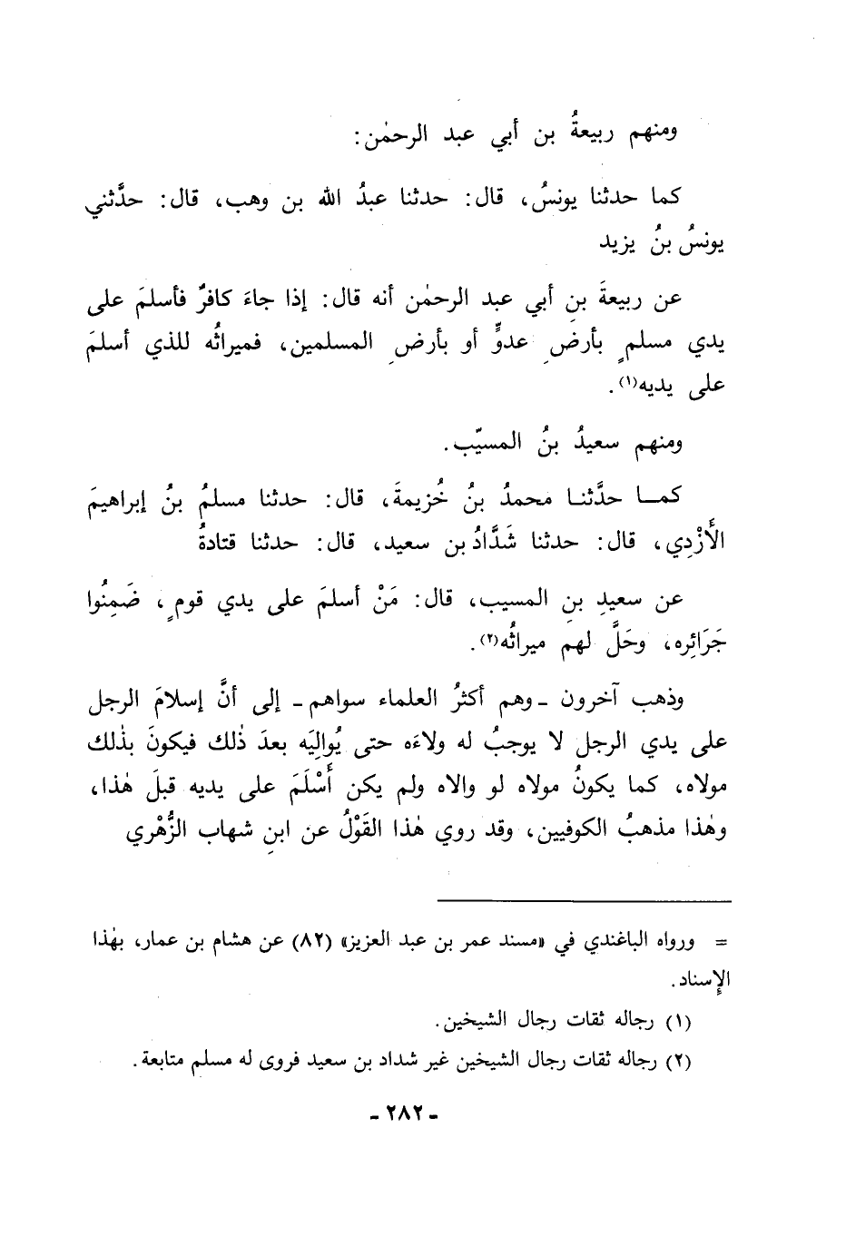كَمَا حَدَّثَنَا مُحَمَّدُ بْنُ خُزَيْمَةَ قَالَ: حَدَّثَنَا مُسْلِمُ بْنُ إِبْرَاهِيمَ الْأَزْدِيُّ قَالَ: حَدَّثَنَا شَدَّادُ بْنُ سَعِيدٍ قَالَ: حَدَّثَنَا قَتَادَةَ، عَنْ سَعِيدِ بْنِ الْمُسَيِّبِ قَالَ: " مَنْ أَسْلَمَ عَلَى يَدَيْ قَوْمٍ ضَمِنُوا جَرَائِرَهُ وَحَلَّ لَهُمْ مِيرَاثُهُ " وَذَهَبَ آخَرُونَ , وَهُمْ أَكْثَرُ الْعُلَمَاءِ سِوَاهُمْ إِلَى أَنَّ إِسْلَامَ الرَّجُلِ عَلَى يَدَيِ الرَّجُلِ لَا يُوجِبُ لَهُ وَلَاءَهُ حَتَّى يُوَالِيَهُ بَعْدَ ذَلِكَ , فَيَكُونَ بِذَلِكَ مَوْلَاهُ كَمَا يَكُونُ مَوْلَاهُ لَوْ وَالِاهُ وَلَمْ يَكُنْ أَسْلَمَ عَلَى يَدَيْهِ قَبْلَ هَذَا , وَهَذَا مَذْهَبُ الْكُوفِيِّينَ. وَقَدْ رُوِيَ هَذَا الْقَوْلُ عَنِ ابْنِ شِهَابٍ الزُّهْرِيِّ