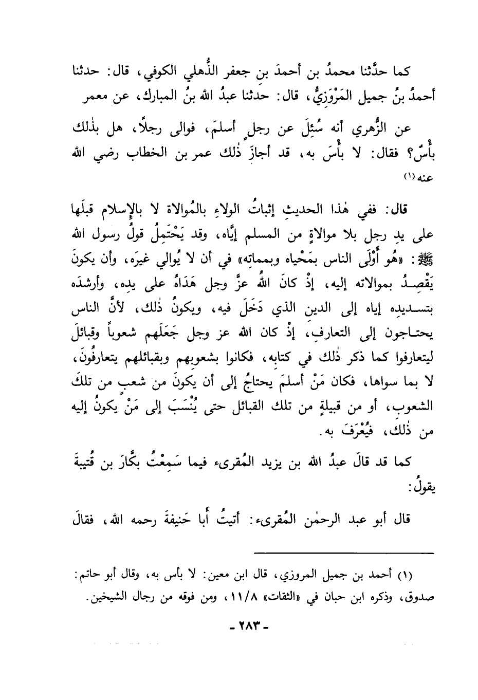 كَمَا حَدَّثَنَا مُحَمَّدُ بْنُ أَحْمَدَ بْنِ جَعْفَرٍ الذُّهْلِيُّ الْكُوفِيُّ قَالَ: حَدَّثَنَا أَحْمَدُ بْنُ جَمِيلٍ الْمَرْوَزِيُّ قَالَ: حَدَّثَنَا عَبْدُ اللهِ بْنُ الْمُبَارَكِ، عَنْ مَعْمَرٍ، عَنِ الزُّهْرِيِّ أَنَّهُ سُئِلَ عَنْ رَجُلٍ أَسْلَمَ , فَوَالَى رَجُلًا , هَلْ بِذَلِكَ بَأْسٌ؟ فَقَالَ: لَا بَأْسَ بِهِ قَدْ أَجَازَ ذَلِكَ عُمَرُ بْنُ الْخَطَّابِ رَضِيَ اللهُ عَنْهُ قَالَ: فَفِي هَذَا الْحَدِيثِ إِثْبَاتُ الْوَلَاءِ بِالْمُوَالِاةِ لَا بِالْإِسْلَامِ قَبْلَهَا عَلَى يَدِ رَجُلٍ بِلَا مُوَالِاةٍ مِنَ الْمُسْلِمِ إِيَّاهُ , وَقَدْ يَحْتَمِلُ قَوْلُ رَسُولِ اللهِ صَلَّى اللَّهُ عَلَيْهِ وَسَلَّمَ: " هُوَ أَوْلَى النَّاسِ بِمَحْيَاهُ وَبِمَمَاتِهِ ". فِي أَنْ لَا يُوَالِيَ غَيْرَهُ , وَأَنْ يَكُونَ يَقْصِدُ بِمُوَالِاتِهِ إِلَيْهِ إِذْ كَانَ اللهُ عَزَّ وَجَلَّ هَدَاهُ عَلَى يَدِهِ , وَأَرْشَدَهُ بِتَسْدِيدِهِ إِيَّاهُ إِلَى الدِّينِ الَّذِي دَخَلَ فِيهِ وَيَكُونُ ذَلِكَ ; لِأَنَّ النَّاسَ يَحْتَاجُونَ إِلَى التَّعَارُفِ إِذْ كَانَ اللهُ عَزَّ وَجَلَّ جَعَلَهُمْ شُعُوبًا وَقَبَائِلَ؛ لِيَتَعَارَفُوا كَمَا ذَكَرَ ذَلِكَ فِي كِتَابِهِ , فَكَانُوا بِشُعُوبِهِمْ وَبِقَبَائِلِهِمْ يَتَعَارَفُونَ لَا بِمَا سِوَاهَا , فَكَانَ مَنْ أَسْلَمَ يَحْتَاجُ إِلَى أَنْ يَكُونَ مِنْ شَعْبٍ مِنْ تِلْكَ الشُّعُوبِ أَوْ مِنْ قَبِيلَةٍ مِنْ تِلْكَ الْقَبَائِلِ حَتَّى يُنْسَبَ إِلَى مَنْ يَكُونُ إِلَيْهِ مِنْ ذَلِكَ , فَيُعْرَفَ بِهِ
