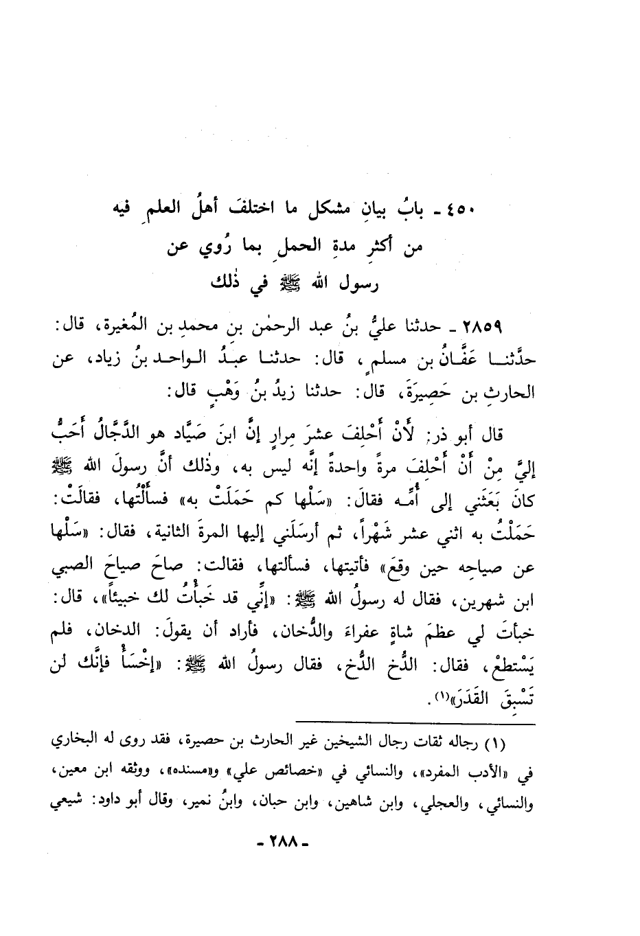 2859 - حَدَّثَنَا عَلِيُّ بْنُ عَبْدِ الرَّحْمَنِ بْنِ مُحَمَّدِ بْنِ الْمُغِيرَةِ قَالَ: حَدَّثَنَا عَفَّانُ بْنُ مُسْلِمٍ قَالَ: حَدَّثَنَا عَبْدُ الْوَاحِدِ بْنُ زِيَادٍ، عَنِ الْحَارِثِ بْنِ حَصِيرَةَ قَالَ: حَدَّثَنَا زَيْدُ بْنُ وَهْبٍ قَالَ: قَالَ أَبُو ذَرٍّ: لَأَنْ أَحْلِفَ عَشْرَ مِرَارٍ أَنَّ ابْنَ صَيَّادٍ، هُوَ الدَّجَّالُ أَحَبُّ إِلَيَّ مِنْ أَنْ أَحْلِفَ مَرَّةً وَاحِدَةً إِنَّهُ لَيْسَ بِهِ , وَذَلِكَ أَنَّ رَسُولَ اللهِ صَلَّى اللَّهُ عَلَيْهِ وَسَلَّمَ كَانَ بَعَثَنِي إِلَى أُمِّهِ , فَقَالَ: " سَلْهَا كَمْ حَمَلَتْ بِهِ " , فَسَأَلْتُهَا , فَقَالَتْ: حَمَلْتُ بِهِ اثْنَيْ عَشَرَ شَهْرًا، ثُمَّ أَرْسَلَنِي إِلَيْهَا الْمَرَّةَ الثَّانِيَةَ , فَقَالَ: " سَلْهَا عَنْ صِيَاحِهِ حِينَ وَقَعَ؟ " فَأَتَيْتُهَا , فَسَأَلْتُهَا , فَقَالَتْ: صَاحَ صِيَاحَ الصَّبِيِّ ابْنِ شَهْرَيْنِ , فَقَالَ لَهُ رَسُولُ اللهِ صَلَّى اللَّهُ عَلَيْهِ وَسَلَّمَ: " إِنِّي قَدْ خَبَأْتُ لَكَ خَبِيئًا " قَالَ: خَبَأْتَ لِي عَظْمَ شَاةٍ عَفْرَاءَ، وَالدُّخَانَ فَأَرَادَ أَنْ يَقُولَ الدُّخَانَ فَلَمْ يَسْتَطِعْ , فَقَالَ: الدُّخُّ الدُّخُّ , فَقَالَ رَسُولُ اللهِ صَلَّى اللَّهُ عَلَيْهِ وَسَلَّمَ: " اخْسَأْ فَإِنَّكَ لَنْ تَسْبِقَ الْقَدَرَ " -[289]- فَكَانَ هَذَا الْحَدِيثُ حِكَايَةَ أَبِي ذَرٍّ عَنْ أُمِّ ابْنِ صَيَّادٍ أَنَّهَا حَمَلَتْ بِهِ اثْنَيْ عَشَرَ , وَلَيْسَ فِيهِ رُجُوعُهُ بِذَلِكَ إِلَى النَّبِيِّ صَلَّى اللَّهُ عَلَيْهِ وَسَلَّمَ , فَيُنْكِرُهُ أَوْ لَا يُنْكِرُهُ , فَنَظَرْنَا هَلْ نَجِدُ ذَلِكَ فِي هَذَا مِنْ غَيْرِ هَذِهِ الرِّوَايَةِ