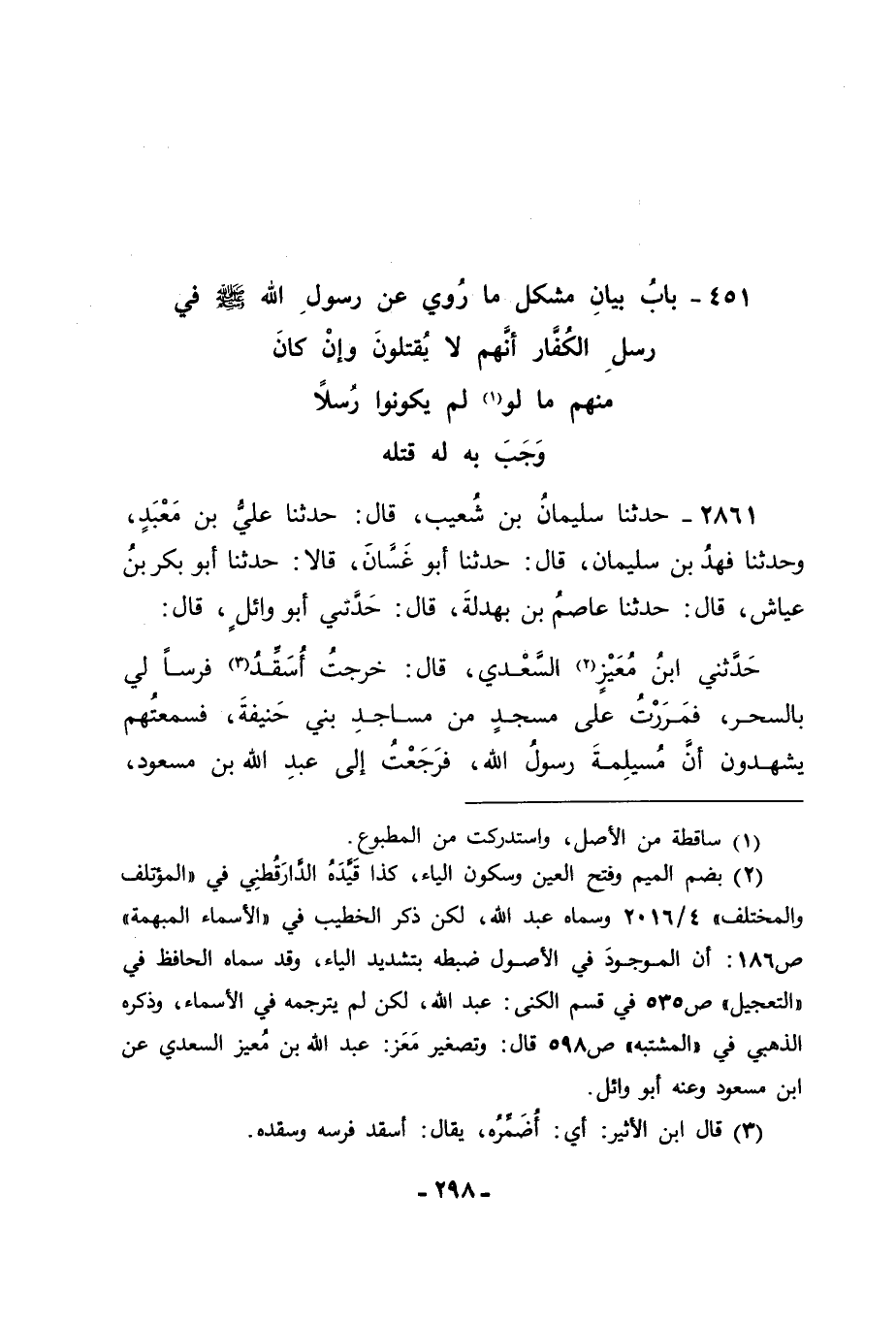 2861 - حَدَّثَنَا سُلَيْمَانُ بْنُ شُعَيْبٍ قَالَ: حَدَّثَنَا عَلِيُّ بْنُ مَعْبَدٍ، وَحَدَّثَنَا فَهْدُ بْنُ سُلَيْمَانَ قَالَ: حَدَّثَنَا أَبُو غَسَّانَ قَالَا: حَدَّثَنَا أَبُو بَكْرِ بْنُ عَيَّاشٍ قَالَ: حَدَّثَنَا عَاصِمُ ابْنُ بَهْدَلَةَ قَالَ: حَدَّثَنِي أَبُو وَائِلٍ قَالَ: حَدَّثَنِي ابْنُ مُعَيْزٍ السَّعْدِيُّ قَالَ: خَرَجْتُ أُسَقِّدُ فَرَسًا لِي بِالسَّحَرِ , فَمَرَرْتُ عَلَى مَسْجِدٍ مِنْ مَسَاجِدِ بَنِي حَنِيفَةَ فَسَمِعْتُهُمْ يَشْهَدُونَ أَنَّ مُسَيْلِمَةَ رَسُولُ اللهِ , فَرَجَعْتُ إِلَى عَبْدِ اللهِ بْنِ مَسْعُودٍ , -[299]- فَذَكَرْتُ لَهُ أَمْرَهُمْ , فَبَعَثَ الشُّرَطَ , فَأَخَذُوهُمْ , فَجِيءَ بِهِمْ إِلَيْهِ , فَتَابُوا وَرَجَعُوا عَمَّا قَالُوهُ , وَقَالُوا: لَا نَعُودُ , فَخَلَّى سَبِيلَهُمْ وَقَدَّمَ رَجُلًا مِنْهُمْ يُقَالُ لَهُ: عَبْدُ اللهِ بْنُ النَّوَّاحَةِ فَضَرَبَ عُنُقَهُ , فَقَالَ النَّاسُ: أَخَذْتَ أَقْوَامًا فِي أَمْرٍ وَاحِدٍ فَخَلَّيْتَ سَبِيلَ بَعْضِهِمْ , وَقَتَلْتَ بَعْضَهُمْ , فَقَالَ: كُنْتُ عِنْدَ رَسُولِ اللهِ صَلَّى اللَّهُ عَلَيْهِ وَسَلَّمَ جَالِسًا , فَجَاءَهُ ابْنُ النَّوَّاحَةِ وَرَجُلٌ مَعَهُ يُقَالُ لَهُ ابْنُ وَثَّالِ حَجْرٍ وَافِدَيْنِ مِنْ عِنْدِ مُسَيْلِمَةَ , فَقَالَ لَهُمَا رَسُولُ اللهِ صَلَّى اللَّهُ عَلَيْهِ وَسَلَّمَ: " أَتَشْهَدَانِ أَنِّي رَسُولُ اللهِ صَلَّى اللَّهُ عَلَيْهِ وَسَلَّمَ؟ " , فَقَالَا: أَتَشْهَدُ أَنْتَ أَنَّ مُسَيْلِمَةَ رَسُولُ اللهِ؟ فَقَالَ: " آمَنْتُ بِاللهِ عَزَّ وَجَلَّ وَبِرَسُولِهِ , لَوْ كُنْتُ قَاتِلًا وَفْدًا لَقَتَلْتُكُمَا " , فَلِذَلِكَ قَتَلْتُ هَذَا