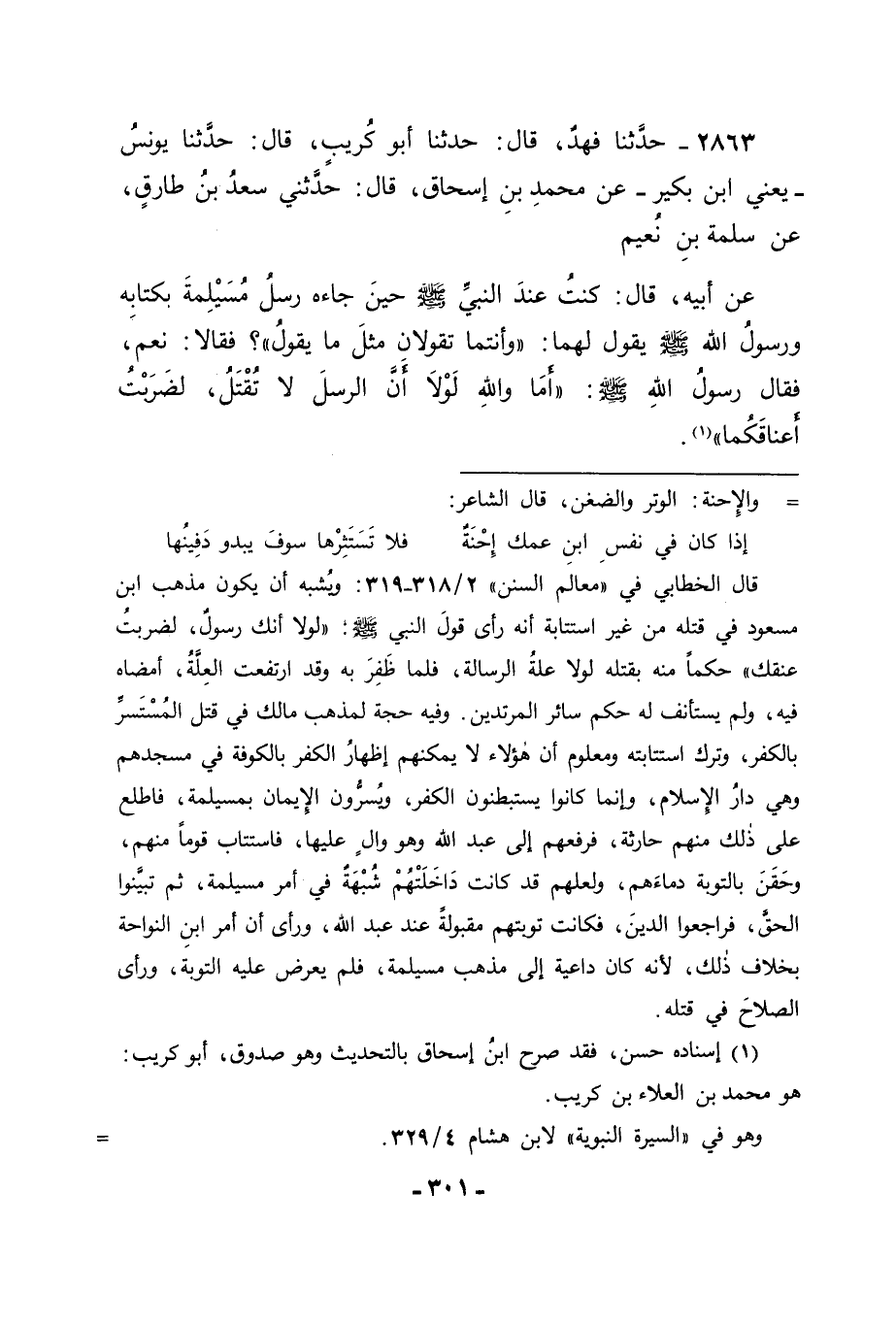 2863 - حَدَّثَنَا فَهْدٌ قَالَ: حَدَّثَنَا أَبُو كُرَيْبٍ قَالَ: حَدَّثَنَا يُونُسُ يَعْنِي ابْنَ بُكَيْرٍ، عَنْ مُحَمَّدِ بْنِ إِسْحَاقَ قَالَ: حَدَّثَنِي سَعْدُ بْنُ طَارِقٍ، عَنْ سَلَمَةَ بْنِ نُعَيْمٍ، عَنْ أَبِيهِ قَالَ: كُنْتُ عِنْدَ النَّبِيِّ صَلَّى اللَّهُ عَلَيْهِ وَسَلَّمَ حِينَ جَاءَهُ رُسُلُ مُسَيْلِمَةَ بِكِتَابِهِ , وَرَسُولُ اللهِ صَلَّى اللَّهُ عَلَيْهِ وَسَلَّمَ يَقُولُ لَهُمَا وَأَنْتُمَا تَقُولَانِ مِثْلَ مَا يَقُولُ؟ فَقَالَا: نَعَمْ , فَقَالَ رَسُولُ اللهِ صَلَّى اللَّهُ عَلَيْهِ وَسَلَّمَ: " أَمَا وَاللهِ لَوْلَا أَنَّ الرُّسُلَ لَا تُقْتَلُ لَضَرَبْتُ أَعْنَاقَكُمَا " -[302]- فَتَأَمَّلْنَا هَذِهِ الْآثَارَ طَلَبَ الْوُقُوفِ عَلَى الْمُرَادِ بِمَا فِيهَا مِنْ رَفْعِ رَسُولِ اللهِ صَلَّى اللَّهُ عَلَيْهِ وَسَلَّمَ عَنِ الْوُفُودِ أَنْ لَا تُقْتَلَ , وَإِنْ كَانَ مِنْهَا مِثْلُ الَّذِي كَانَ مِنَ ابْنِ النَّوَّاحَةِ وَصَاحِبِهِ مِمَّا يُوجِبُ قَتْلَهُمَا لَوْ لَمْ يَكُونَا رَسُولَيْنِ , فَوَجَدْنَا اللهَ عَزَّ وَجَلَّ قَدْ قَالَ فِي كِتَابِهِ لِرَسُولِهِ صَلَّى اللَّهُ عَلَيْهِ وَسَلَّمَ {وَإِنْ أَحَدٌ مِنَ الْمُشْرِكِينَ اسْتَجَارَكَ فَأَجِرْهُ حَتَّى يَسْمَعَ كَلَامَ اللهِ} [التوبة: 6] أَيْ فَيَتَّبِعَهُ , أَيْ: يَجِبُ عَلَيْهِ الْمُقَامُ حَيْثُ يُقِيمُ الْمُسْلِمُونَ سِوَاهُ أَوْ لَا يَتَّبِعَهُ فَيُبْلِغَهُ مَأْمَنَهُ , وَكَانَ فِي تَرْكِهِ اتِّبَاعَهُ بَقَاؤُهُ عَلَى كُفْرِهِ الَّذِي يُوجِبُ سَفْكَ دَمِهِ لَوْ لَمْ يَأْتِهِ طَالِبًا لِاسْتِمَاعِ كَلَامِ اللهِ , فَحَرُمَ بِذَلِكَ سَفْكُ دَمِهِ حَتَّى يَخْرُجَ عَنْ ذَلِكَ الطَّلَبِ وَيَصِيرَ إِلَى مَأْمَنِهِ , فَيَحِلَّ بَعْدَ ذَلِكَ سَفْكَ دَمِهِ , فَكَانَ مِثْلَ ذَلِكَ الرُّسُلِ الَّذِينَ يُبَلِّغُونَ مَنْ أَرْسَلَهُمْ عَنْ رَسُولِ اللهِ صَلَّى اللَّهُ عَلَيْهِ وَسَلَّمَ جَوَابَهُ لَهُمْ فِيمَا أَرْسَلُوهُمْ فِيهِ إِلَيْهِ مِنْهُ , وَسَمَاعُهُمْ كَلَامَ اللهِ عَزَّ وَجَلَّ لِيَكُونَ مَنْ يَصِيرُونَ إِلَيْهِ بِذَلِكَ يَقْبَلُهُ فَيَدْخُلُ فِي الْإِيمَانِ أَوْ لَا يَقْبَلُهُ فَيَبْقَى عَلَى حَرْبِيَّتِهِ وَعَلَى حِلِّ سَفْكِ دَمِهِ , فَهَذَا عِنْدَنَا هُوَ الْمَعْنَى الَّذِي بِهِ رَفَعَ رَسُولُ اللهِ صَلَّى اللَّهُ عَلَيْهِ وَسَلَّمَ عَنِ الرُّسُلِ الْقَتْلَ , وَإِنْ كَانَ مِنْهُمْ مَا يُوجِبُ قَتْلَهُمْ لَوْ لَمْ يَكُونُوا رُسُلًا , وَاللهَ نَسْأَلُهُ التَّوْفِيقَ