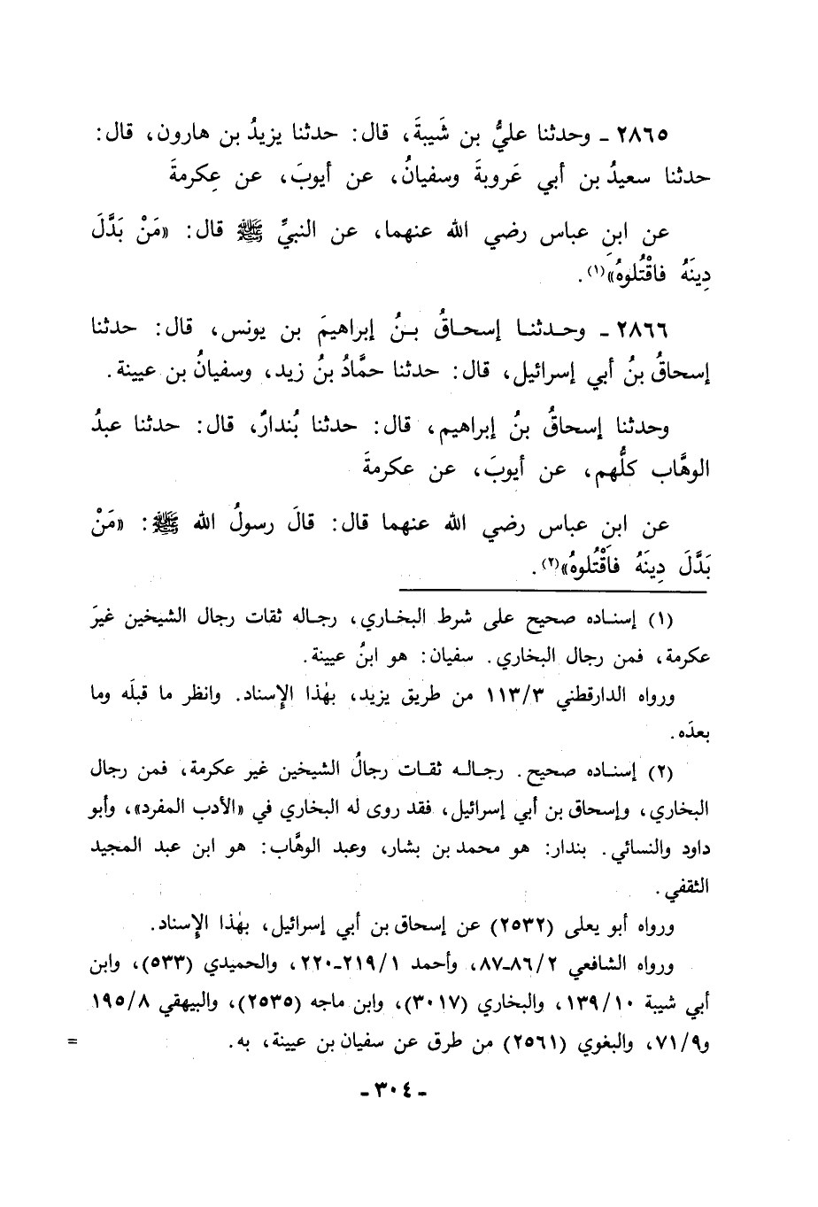 2866 - وَحَدَّثَنَا إِسْحَاقُ بْنُ إِبْرَاهِيمَ بْنِ يُونُسَ قَالَ: حَدَّثَنَا إِسْحَاقُ بْنُ أَبِي إِسْرَائِيلَ قَالَ: حَدَّثَنَا حَمَّادُ بْنُ زَيْدٍ، وَسُفْيَانُ بْنُ عُيَيْنَةَ، وَحَدَّثَنَا إِسْحَاقُ بْنُ إِبْرَاهِيمَ قَالَ: حَدَّثَنَا بُنْدَارٌ قَالَ: حَدَّثَنَا عَبْدُ الْوَهَّابِ كُلُّهُمْ عَنْ أَيُّوبَ، عَنْ عِكْرِمَةَ، عَنِ ابْنِ عَبَّاسٍ رَضِيَ اللهُ عَنْهُمَا قَالَ: قَالَ رَسُولُ اللهِ صَلَّى اللَّهُ عَلَيْهِ وَسَلَّمَ: " مَنْ بَدَّلَ دِينَهُ فَاقْتُلُوهُ "