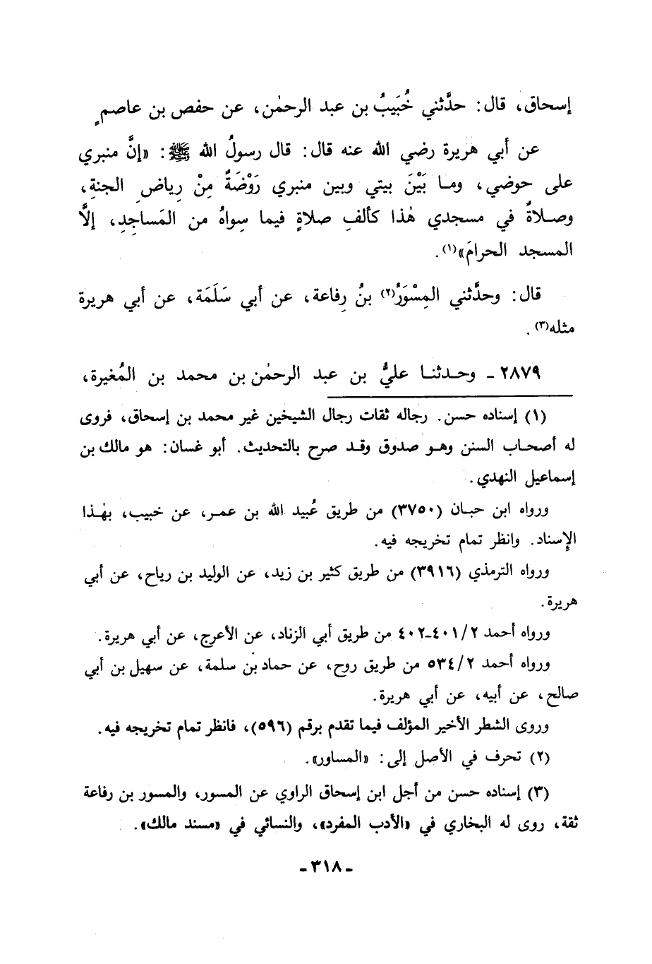 2879 - وَحَدَّثَنَا عَلِيُّ بْنُ عَبْدِ الرَّحْمَنِ بْنِ مُحَمَّدِ بْنِ الْمُغِيرَةِ، -[319]- وَمُحَمَّدُ بْنُ عَلِيِّ بْنِ دَاوُدَ قَالَا: حَدَّثَنَا عَفَّانُ بْنُ مُسْلِمٍ قَالَ: حَدَّثَنَا عَبْدُ الْوَاحِدِ بْنُ زِيَادٍ قَالَ: حَدَّثَنَا إِسْحَاقُ بْنُ شَرَفِيٍّ مَوْلَى آلِ عُمَرَ قَالَ: حَدَّثَنِي أَبُو بَكْرِ بْنُ عَبْدِ الرَّحْمَنِ أَنَّ عَبْدَ اللهِ بْنَ عُمَرَ قَالَ: حَدَّثَنِي أَبُو سَعِيدٍ الْخُدْرِيُّ قَالَ: قَالَ رَسُولُ اللهِ صَلَّى اللَّهُ عَلَيْهِ وَسَلَّمَ: " مَا بَيْنَ قَبْرِي وَمِنْبَرِي رَوْضَةٌ مِنْ رِيَاضِ الْجَنَّةِ "