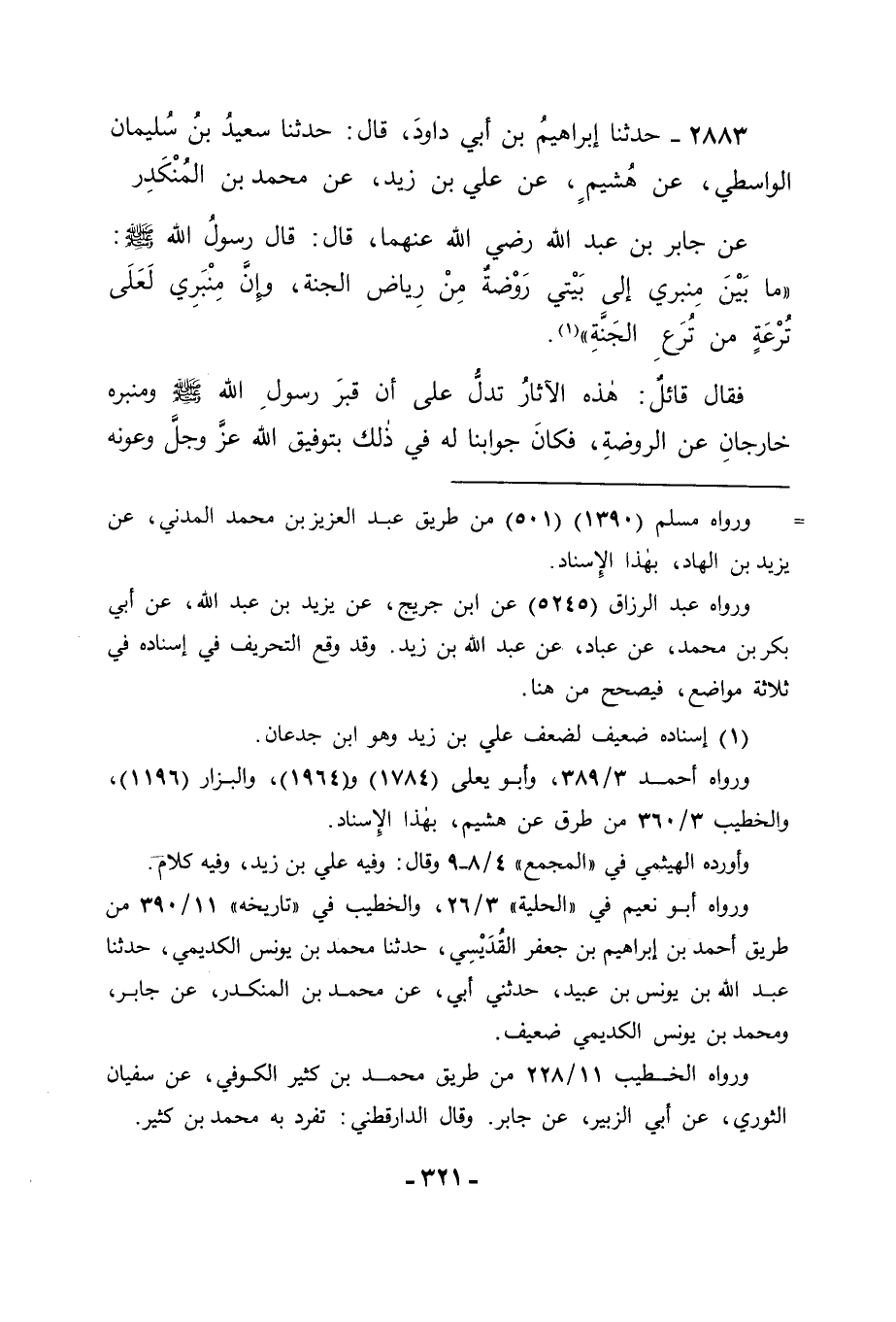 2883 - حَدَّثَنَا إِبْرَاهِيمُ بْنُ أَبِي دَاوُدَ قَالَ: حَدَّثَنَا سَعِيدُ بْنُ سُلَيْمَانَ الْوَاسِطِيُّ، عَنْ هُشَيْمٍ، عَنْ عَلِيِّ بْنِ زَيْدٍ، عَنْ مُحَمَّدِ بْنِ الْمُنْكَدِرِ، عَنْ جَابِرِ بْنِ عَبْدِ اللهِ رَضِيَ اللهُ عَنْهُمَا قَالَ: قَالَ رَسُولُ اللهِ صَلَّى اللَّهُ عَلَيْهِ وَسَلَّمَ: " مَا بَيْنَ مِنْبَرِي إِلَى بَيْتِي رَوْضَةٌ مِنْ رِيَاضِ الْجَنَّةِ , وَإِنَّ مِنْبَرِي لَعَلَى تُرْعَةٍ مِنْ تُرَعِ الْجَنَّةِ " , فَقَالَ قَائِلٌ: هَذِهِ الْآثَارُ تَدُلُّ عَلَى أَنَّ قَبْرَ رَسُولِ اللهِ صَلَّى اللَّهُ عَلَيْهِ وَسَلَّمَ وَمِنْبَرَهُ خَارِجَانِ عَنِ الرَّوْضَةِ فَكَانَ جَوَابُنَا لَهُ فِي ذَلِكَ بِتَوْفِيقِ اللهِ عَزَّ وَجَلَّ وَعَوْنِهِ -[322]- أَنَّهُ قَدْ يَجُوزُ أَنْ يَكُونَا خَارِجَيْنِ مِنَ الرَّوْضَةِ كَمَا ذَكَرَ , وَيَكُونَ مِنْبَرُهُ عَلَى مَا قَدْ بَيَّنَ فِي هَذِهِ الْآثَارِ الَّتِي قَدْ رَوَيْنَاهَا فِي هَذَا الْبَابِ أَنَّ قَوَائِمَهُ رَوَاتِبُ فِي الْجَنَّةِ فَيَكُونَ مِنَ الْجَنَّةِ فِي خِلَافِ الرَّوْضَةِ. وَقَدْ دَلَّ عَلَى هَذَا التَّأْوِيلِ مَا قَدْ رُوِيَ عَنْ سَهْلِ بْنِ سَعْدٍ عَنْ رَسُولِ اللهِ صَلَّى اللَّهُ عَلَيْهِ وَسَلَّمَ فِي هَذَا الْمَعْنَى
