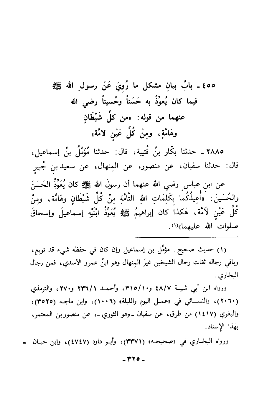 2885 - حَدَّثَنَا بَكَّارُ بْنُ قُتَيْبَةَ قَالَ: حَدَّثَنَا مُؤَمَّلُ بْنُ إِسْمَاعِيلَ قَالَ: حَدَّثَنَا سُفْيَانُ، عَنْ مَنْصُورٍ، عَنِ الْمِنْهَالِ، عَنْ سَعِيدِ بْنِ جُبَيْرٍ، عَنِ ابْنِ عَبَّاسٍ رَضِيَ اللهُ عَنْهُمَا أَنَّ رَسُولَ اللهِ صَلَّى اللَّهُ عَلَيْهِ وَسَلَّمَ كَانَ يُعَوِّذُ الْحَسَنَ، وَالْحُسَيْنَ أُعِيذُكُمَا بِكَلِمَاتِ اللهِ التَّامَّةِ مِنْ كُلِّ شَيْطَانٍ , وَهَامَّةٍ , وَمِنْ كُلِّ عَيْنٍ لَامَّةٍ هَكَذَا كَانَ إِبْرَاهِيمُ صَلَّى اللَّهُ عَلَيْهِ وَسَلَّمَ يُعَوِّذُ ابْنَيْهِ إِسْمَاعِيلَ , وَإِسْحَاقَ صَلَوَاتُ اللهِ عَلَيْهِمَا " , -[326]- فَقَالَ قَائِلٌ: فَكَيْفَ يَجُوزُ أَنْ تَقْبَلُوا هَذَا عَنْ رَسُولِ اللهِ صَلَّى اللَّهُ عَلَيْهِ وَسَلَّمَ وَأَنْتُمْ تَرْوُونَ عَنْهُ