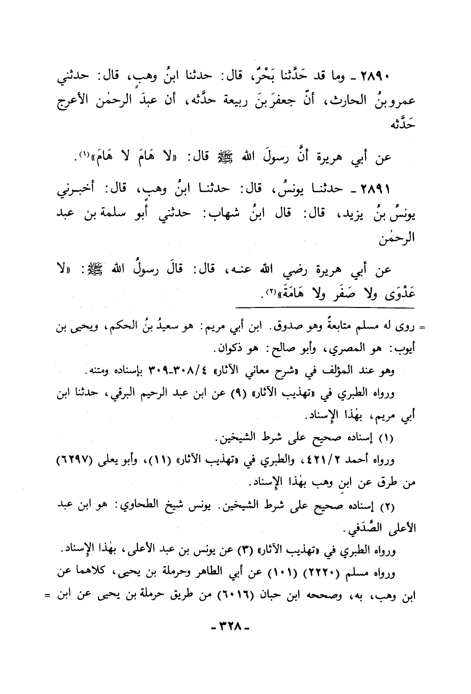 2890 - وَمَا قَدْ حَدَّثَنَا بَحْرٌ قَالَ: حَدَّثَنَا ابْنُ وَهْبٍ قَالَ: حَدَّثَنِي عَمْرُو بْنُ الْحَارِثِ أَنَّ جَعْفَرَ بْنَ رَبِيعَةَ حَدَّثَهُ، أَنَّ عَبْدَ الرَّحْمَنِ الْأَعْرَجَ حَدَّثَهُ، عَنْ أَبِي هُرَيْرَةَ أَنَّ رَسُولَ اللهِ صَلَّى اللَّهُ عَلَيْهِ وَسَلَّمَ قَالَ: " لَا هَامَ لَا هَامَ "