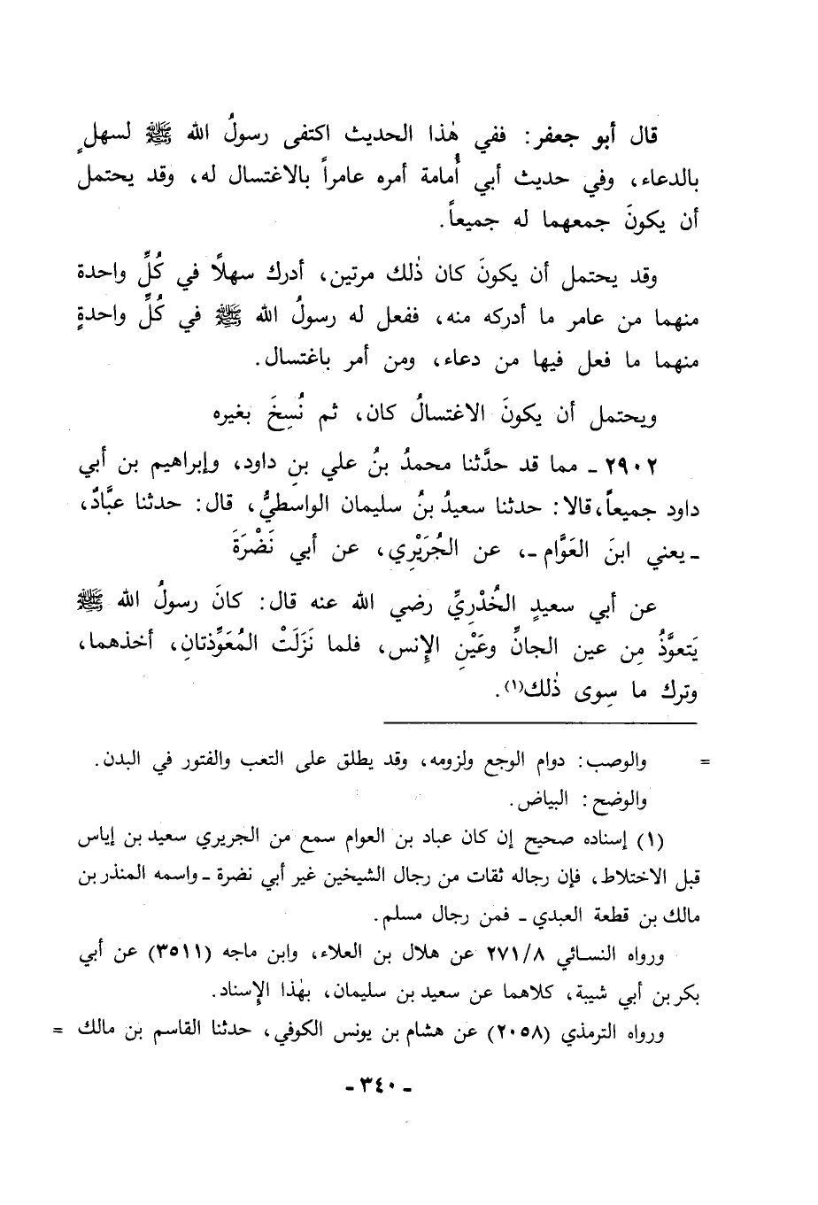 2902 - مِمَّا قَدْ حَدَّثَنَا مُحَمَّدُ بْنُ عَلِيِّ بْنِ دَاوُدَ، وَإِبْرَاهِيمُ بْنُ أَبِي دَاوُدَ جَمِيعًا قَالَا: حَدَّثَنَا سَعِيدُ بْنُ سُلَيْمَانَ الْوَاسِطِيُّ قَالَ: حَدَّثَنَا عَبَّادٌ يَعْنِي ابْنَ الْعَوَّامِ، عَنِ الْجُرَيْرِيِّ، عَنْ أَبِي نَضْرَةَ، عَنْ أَبِي سَعِيدٍ الْخُدْرِيِّ رَضِيَ اللهُ عَنْهُ قَالَ: " كَانَ رَسُولُ اللهِ صَلَّى اللَّهُ عَلَيْهِ وَسَلَّمَ يَتَعَوَّذُ مِنْ عَيْنِ الْجَانِّ، وَعَيْنِ الْإِنْسِ , فَلَمَّا نَزَلَتِ الْمُعَوِّذَتَانِ أَخَذَهُمَا , وَتَرَكَ مَا سِوَى ذَلِكَ -[341]- وَقَدْ رُوِيَ مِنْهَا أَيْضًا