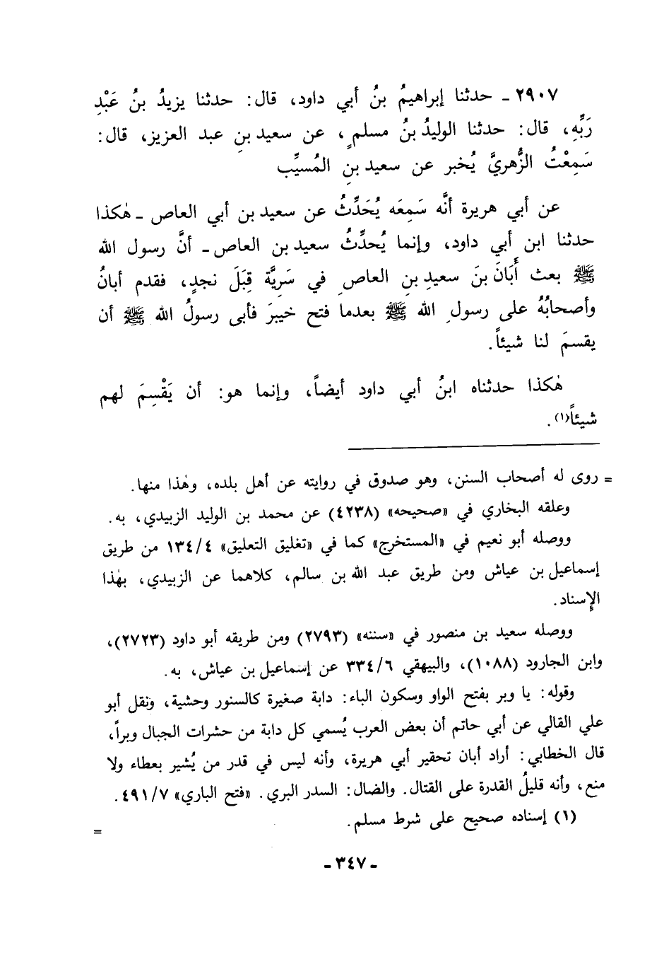 2907 - حَدَّثَنَا إِبْرَاهِيمُ بْنُ أَبِي دَاوُدَ قَالَ: حَدَّثَنَا يَزِيدُ بْنُ عَبْدِ رَبِّهِ قَالَ: حَدَّثَنَا الْوَلِيدُ بْنُ مُسْلِمٍ، عَنْ سَعِيدِ بْنِ عَبْدِ الْعَزِيزِ قَالَ: سَمِعْتُ الزُّهْرِيَّ يُخْبِرُ عَنْ سَعِيدِ بْنِ الْمُسَيِّبِ، عَنْ أَبِي هُرَيْرَةَ أَنَّهُ سَمِعَهُ يُحَدِّثُ، عَنْ سَعِيدِ بْنِ أَبِي الْعَاصِ - هَكَذَا حَدَّثَنَا ابْنُ أَبِي دَاوُدَ، وَإِنَّمَا يُحَدِّثُ سَعِيدَ بْنَ الْعَاصِ -: أَنَّ رَسُولَ اللهِ صَلَّى اللَّهُ عَلَيْهِ وَسَلَّمَ بَعَثَ أَبَانَ بْنَ سَعِيدِ بْنِ الْعَاصِ فِي سَرِيَّةٍ قِبَلَ نَجْدٍ فَقَدِمَ أَبَانُ وَأَصْحَابُهُ عَلَى رَسُولِ اللهِ صَلَّى اللَّهُ عَلَيْهِ وَسَلَّمَ بَعْدَمَا فَتَحَ خَيْبَرَ فَأَبَى رَسُولُ اللهِ صَلَّى اللَّهُ عَلَيْهِ وَسَلَّمَ أَنْ يَقْسِمَ لَنَا شَيْئًا " هَكَذَا حَدَّثَنَاهُ ابْنُ أَبِي دَاوُدَ أَيْضًا , وَإِنَّمَا هُوَ أَنْ يَقْسِمَ لَهُمْ شَيْئًا -[348]- قَالَ أَبُو جَعْفَرٍ: فَفِي هَذَا الْحَدِيثِ أَنَّ السَّائِلَ لِرَسُولِ اللهِ صَلَّى اللَّهُ عَلَيْهِ وَسَلَّمَ أَنْ يَقْسِمَ لَهُ , وَلِأَصْحَابِهِ هُوَ أَبَانُ وَقَدْ رُوِيَ أَنَّ السَّائِلَ لِرَسُولِ اللهِ صَلَّى اللَّهُ عَلَيْهِ وَسَلَّمَ ذَلِكَ كَانَ هُوَ أَبُو هُرَيْرَةَ