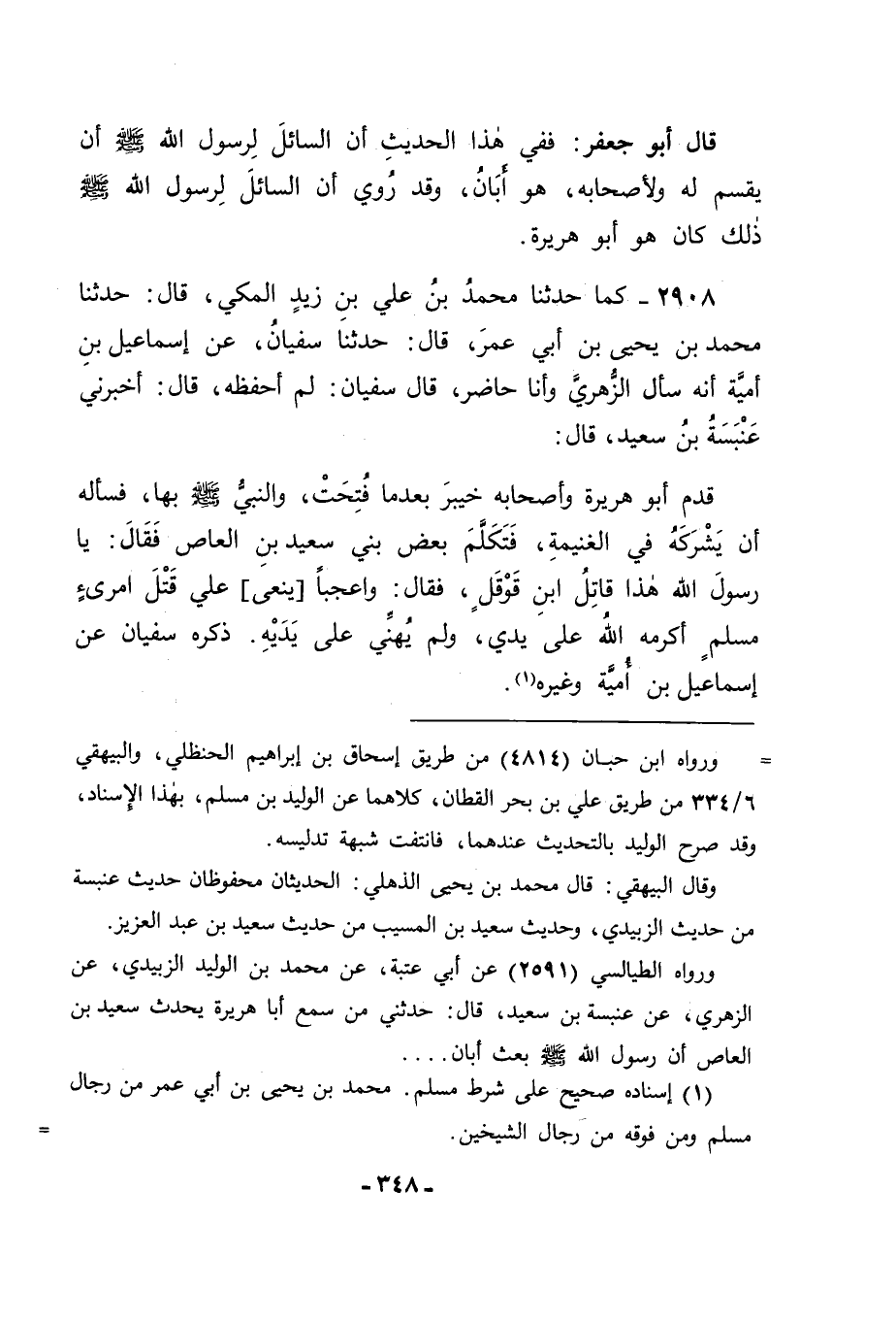 2908 - كَمَا حَدَّثَنَا مُحَمَّدُ بْنُ عَلِيِّ بْنِ زَيْدٍ الْمَكِّيُّ قَالَ: حَدَّثَنَا مُحَمَّدُ بْنُ يَحْيَى بْنِ أَبِي عُمَرَ قَالَ: حَدَّثَنَا سُفْيَانُ، عَنْ إِسْمَاعِيلَ بْنِ أُمَيَّةَ أَنَّهُ سَأَلَ الزُّهْرِيَّ وَأَنَا حَاضِرٌ قَالَ: سُفْيَانُ لَمْ أَحْفَظْهُ. قَالَ: أَخْبَرَنِي عَنْبَسَةُ بْنُ سَعِيدٍ قَالَ: قَدِمَ أَبُو هُرَيْرَةَ وَأَصْحَابُهُ خَيْبَرَ بَعْدَمَا فُتِحَتْ وَالنَّبِيُّ صَلَّى اللَّهُ عَلَيْهِ وَسَلَّمَ بِهَا فَسَأَلَهُ أَنْ يُشْرِكَهُ فِي الْغَنِيمَةِ فَتَكَلَّمَ بَعْضَ بَنِي سَعِيدِ بْنِ الْعَاصِ , فَقَالَ: يَا رَسُولَ اللهِ , هَذَا قَاتِلُ ابْنِ قَوْقَلٍ , فَقَالَ: " وَا عَجَبًا يَنْعَى عَلَيَّ قَتْلَ امْرِئٍ مُسْلِمٍ أَكْرَمَهُ اللهُ عَلَى يَدَيَّ , وَلَمْ يُهِنِّي عَلَى يَدَيْهِ "، ذَكَرَهُ سُفْيَانُ عَنْ إِسْمَاعِيلَ بْنِ أُمَيَّةَ وَغَيْرِهِ