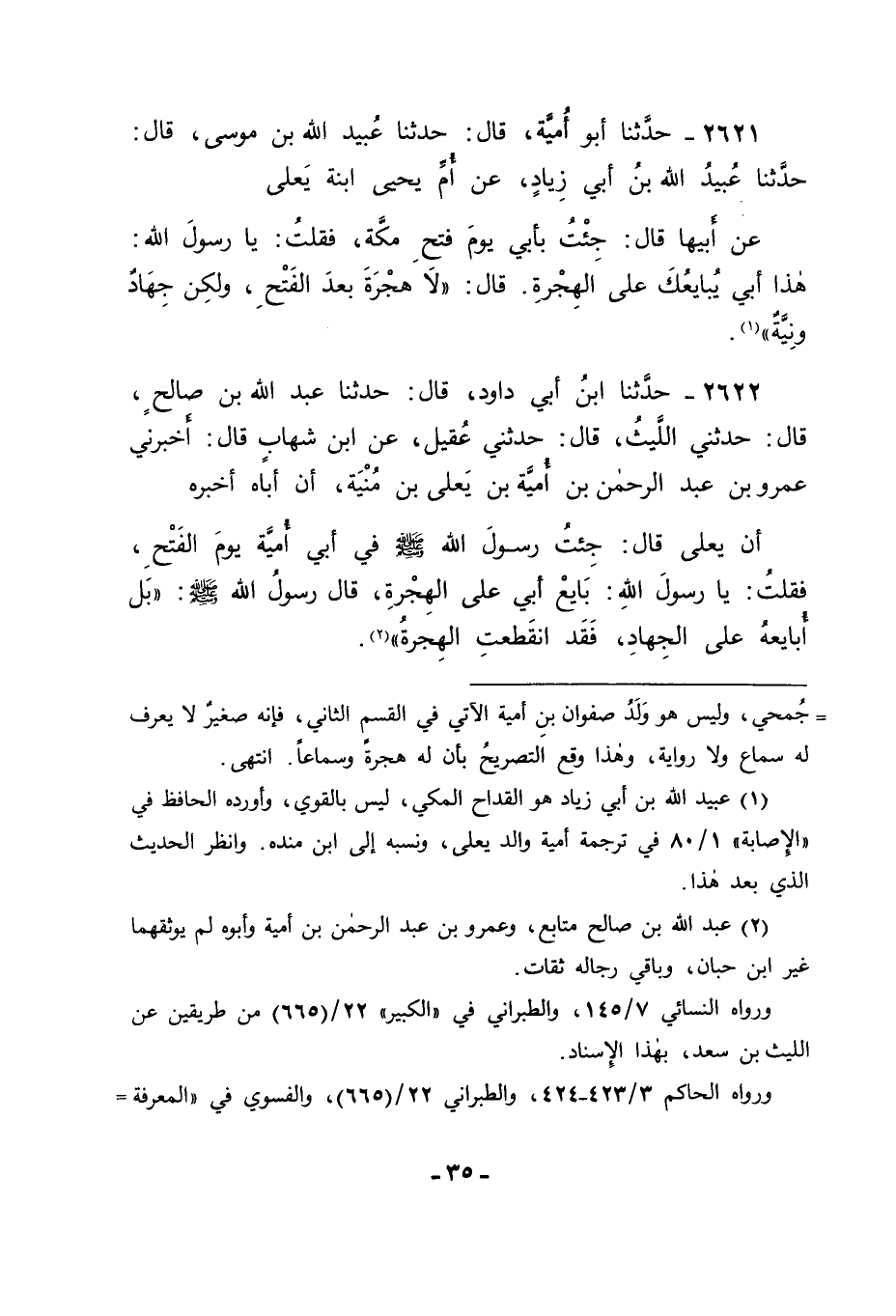 2622 - حَدَّثَنَا ابْنُ أَبِي دَاوُدَ قَالَ: حَدَّثَنَا عَبْدُ اللهِ بْنُ صَالِحٍ قَالَ: حَدَّثَنِي اللَّيْثُ قَالَ: حَدَّثَنِي عُقَيْلٌ، عَنِ ابْنِ شِهَابٍ قَالَ: أَخْبَرَنِي عَمْرُو بْنُ عَبْدِ الرَّحْمَنِ بْنِ أُمَيَّةَ بْنِ يَعْلَى بْنِ مُنْيَةَ أَنَّ أَبَاهُ، أَخْبَرَهُ أَنَّ يَعْلَى، قَالَ: جِئْتُ رَسُولَ اللهِ صَلَّى اللَّهُ عَلَيْهِ وَسَلَّمَ فِي أَبِي أُمَيَّةَ يَوْمَ الْفَتْحِ , فَقُلْتُ: يَا رَسُولَ اللهِ , بَايِعْ أَبِي عَلَى الْهِجْرَةِ. قَالَ رَسُولُ اللهِ صَلَّى اللَّهُ عَلَيْهِ وَسَلَّمَ: " بَلْ أُبَايِعُهُ عَلَى الْجِهَادِ فَقَدِ انْقَطَعَتِ الْهِجْرَةُ "