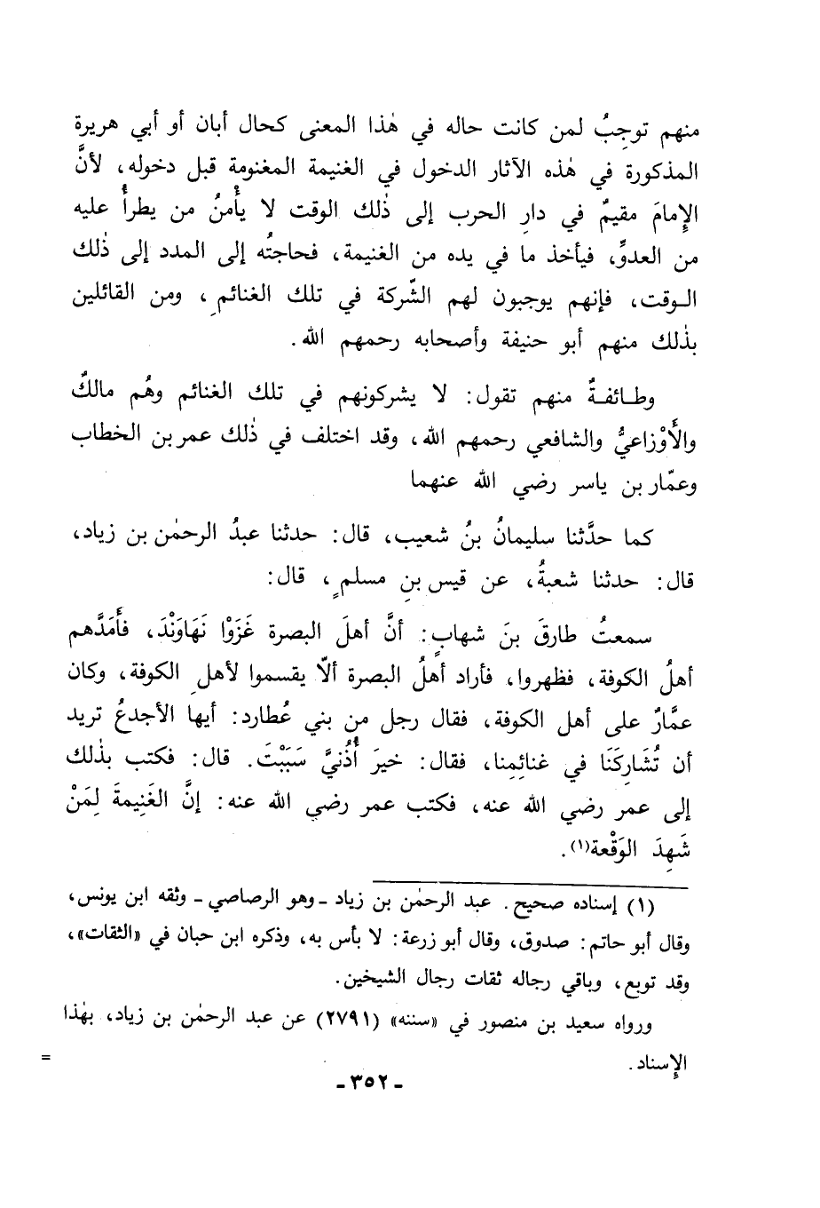 كَمَا حَدَّثَنَا سُلَيْمَانُ بْنُ شُعَيْبٍ قَالَ: حَدَّثَنَا عَبْدُ الرَّحْمَنِ بْنُ زِيَادٍ قَالَ: حَدَّثَنَا شُعْبَةُ، عَنْ قَيْسِ بْنِ مُسْلِمٍ قَالَ: سَمِعْتُ طَارِقَ بْنَ شِهَابٍ أَنَّ أَهْلَ الْبَصْرَةِ غَزَوْا نَهَاوَنْدَ فَأَمَدَّهُمْ أَهْلُ الْكُوفَةِ فَظَهَرُوا، فَأَرَادَ أَهْلُ الْبَصْرَةِ أَلَّا يَقْسِمُوا لِأَهْلِ الْكُوفَةِ وَكَانَ عَمَّارٌ عَلَى أَهْلِ الْكُوفَةِ , فَقَالَ رَجُلٌ: مِنْ بَنِي عُطَارِدٍ: أَيُّهَا الْأَجْدَعُ تُرِيدُ أَنْ تُشَارِكَنَا فِي غَنَائِمِنَا , فَقَالَ: خَيْرَ أُذُنَيَّ سَبَبْتَ قَالَ: فَكَتَبَ بِذَلِكَ إِلَى عُمَرَ رَضِيَ اللهُ عَنْهُ فَكَتَبَ عُمَرُ رَضِيَ اللهُ عَنْهُ: " إِنَّ الْغَنِيمَةَ لِمَنْ شَهِدَ الْوَقْعَةَ " -[353]- قَالَ: وَأَجْمَعَتِ الطَّائِفَتَانِ جَمِيعًا أَنَّ الْإِمَامَ لَوْ كَانَ فَتَحَ تِلْكَ الدَّارَ حَتَّى صَارَتْ كَدَارِ الْمُسْلِمِينَ , وَحَتَّى أَمِنَ مِنَ الْعَدُوِّ وَعَوْدِهِمْ إِلَيْهَا وَقَتَالِهِمْ إِيَّاهُ عَلَى مَا غَنِمَهُ مِنْهُمْ فِيهَا , ثُمَّ لَحِقَهُمْ ذَلِكَ الْمَدَدُ بَعْدَ ذَلِكَ أَنَّهُمْ لَا يُشْرِكُونَهُمْ فِي الْغَنِيمَةِ الَّتِي غَنِمُوهَا قَبْلَ لِحَاقِهِمْ بِهِمْ وَقُدُومِهِمْ عَلَيْهِ , ثُمَّ نَظَرْنَا فِي السَّبَبِ الَّذِي بِهِ مَنَعَ رَسُولُ اللهِ صَلَّى اللَّهُ عَلَيْهِ وَسَلَّمَ أَبَانَ أَوْ أَبَا هُرَيْرَةَ مِنْ إِدْخَالِهِ فِي تِلْكَ الْغَنِيمَةِ مَا هُوَ فَاحْتُمِلَ أَنْ يَكُونَ ; لِأَنَّ خَيْبَرَ قَدْ كَانَتْ صَارَتْ قَبْلَ لِحَاقِهِمْ بِهِ وَقُدُومِهِمْ عَلَيْهِمْ دَارَ إِسْلَامٍ , فَلَمْ يَكُنْ لِرَسُولِ اللهِ صَلَّى اللَّهُ عَلَيْهِ وَسَلَّمَ بِقُدُومِهِمْ عَلَيْهِ حَاجَةٌ فَلَمْ يَقْسِمْ لَهُمْ بِذَلِكَ , وَقَدْ يَحْتَمِلُ أَنْ يَكُونَ لَمْ يَقْسِمْ لَهُمْ ; لِأَنَّ خَيْبَرَ كَانَ اللهُ عَزَّ وَجَلَّ وَعَدَهَا أَهْلَ الْحُدَيْبِيَةِ بِقَوْلِهِ {وَعَدَكُمُ اللهُ مَغَانِمَ كَثِيرَةً تَأْخُذُونَهَا} [الفتح: 20] يُرِيدُ أَهْلَ الْحُدَيْبِيَةِ {فَعَجَّلَ لَكُمْ هَذِهِ} [الفتح: 20] يَعْنِي خَيْبَرَ. وَقَدْ رُوِيَ ذَلِكَ عَنْ أَبِي هُرَيْرَةَ رَضِيَ اللهُ عَنْهُ