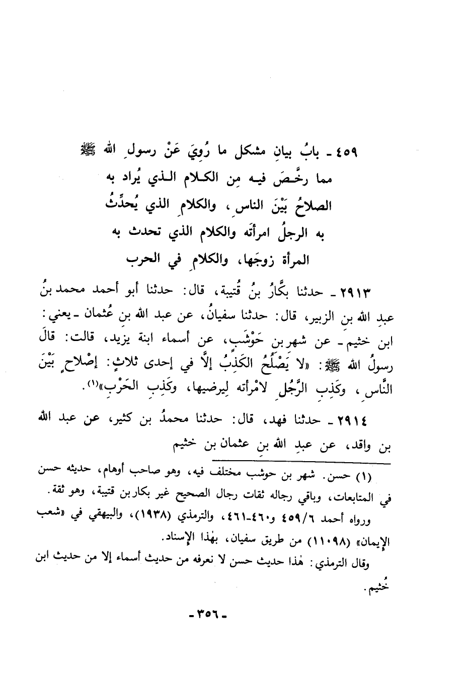 2913 - حَدَّثَنَا بَكَّارُ بْنُ قُتَيْبَةَ قَالَ: حَدَّثَنَا أَبُو أَحْمَدَ مُحَمَّدُ بْنُ عَبْدِ اللهِ بْنِ الزُّبَيْرِ قَالَ: حَدَّثَنَا سُفْيَانُ، عَنْ عَبْدِ اللهِ بْنِ عُثْمَانَ يَعْنِي ابْنَ خُثَيْمٍ، عَنْ شَهْرِ بْنِ حَوْشَبٍ، عَنْ أَسْمَاءَ ابْنَةِ يَزِيدَ قَالَتْ: قَالَ رَسُولُ اللهِ صَلَّى اللَّهُ عَلَيْهِ وَسَلَّمَ: " لَا يَصْلُحُ الْكَذِبُ إِلَّا فِي إِحْدَى ثَلَاثٍ: إِصْلَاحٍ بَيْنَ النَّاسِ، وَكَذِبِ الرَّجُلِ لِامْرَأَتِهِ لِيُرْضِيَهَا، وَكَذِبِ الْحَرْبِ "