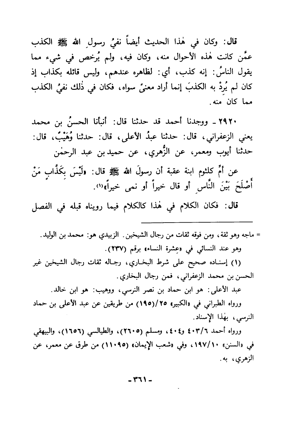 2920 - وَوَجَدْنَا أَحْمَدَ قَدْ حَدَّثَنَا قَالَ: أَنْبَأَنَا الْحُسْنُ بْنُ مُحَمَّدٍ يَعْنِي الزَّعْفَرَانِيَّ قَالَ: حَدَّثَنَا: عَبْدُ الْأَعْلَى قَالَ: حَدَّثَنَا وُهَيْبٌ قَالَ: حَدَّثَنَا أَيُّوبُ، وَمَعْمَرٌ، عَنِ الزُّهْرِيِّ، عَنْ حُمَيْدِ بْنِ عَبْدِ الرَّحْمَنِ، عَنْ أُمِّ كُلْثُومِ ابْنَةِ عُقْبَةَ أَنَّ رَسُولَ اللهِ صَلَّى اللَّهُ عَلَيْهِ وَسَلَّمَ قَالَ: " لَيْسَ بِكَذَّابٍ مَنْ أَصْلَحَ بَيْنَ النَّاسِ أَوْ قَالَ خَيْرًا أَوْ نَمَّى خَيْرًا " قَالَ: فَكَانَ الْكَلَامُ فِي هَذَا كَالْكَلَامِ فِيمَا رَوَيْنَاهُ قَبْلَهُ فِي الْفَصْلِ -[362]- الثَّانِي مِنَ الْفَصْلَيْنِ اللَّذَيْنِ تَقَدَّمَتْ رِوَايَتُنَا لَهُمَا فِي هَذَا الْبَابِ , فَقَالَ قَائِلٌ: فَقَدْ رُوِيَ حَدِيثُ أُمِّ كُلْثُومٍ هَذَا بِمِثْلِ مَا رُوِيَ بِهِ حَدِيثُ أَسْمَاءَ فَذَكَرَ مَا