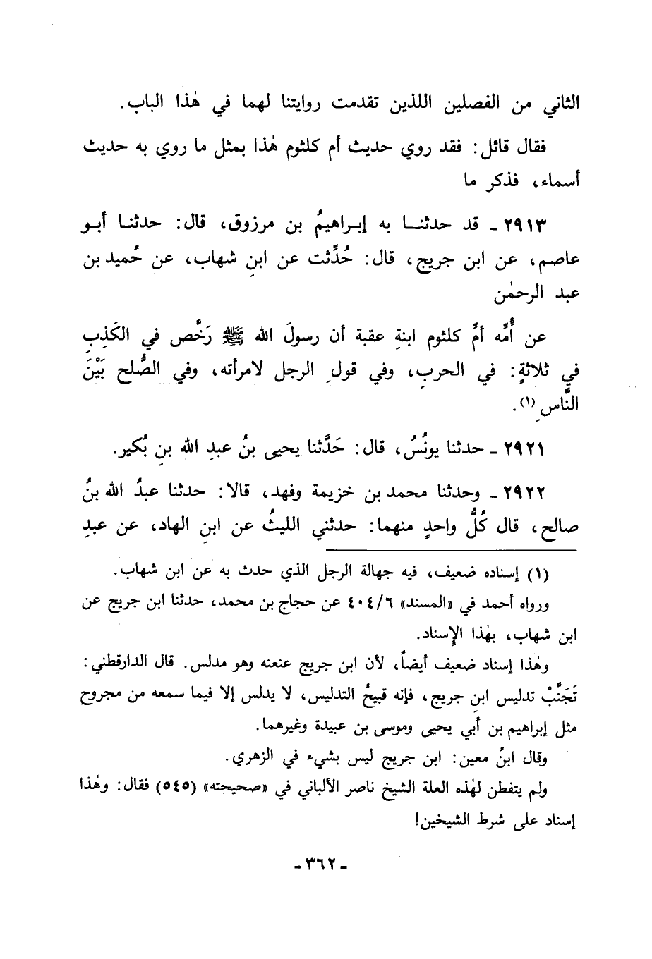 2922 - حَدَّثَنَا يُونُسُ قَالَ: حَدَّثَنَا يَحْيَى بْنُ عَبْدِ اللهِ بْنِ بُكَيْرٍ، وَحَدَّثَنَا مُحَمَّدُ بْنُ خُزَيْمَةَ، وَفَهْدٌ قَالَا: حَدَّثَنَا عَبْدُ اللهِ بْنُ صَالِحٍ قَالَ: كُلُّ وَاحِدٍ مِنْهُمَا حَدَّثَنِي اللَّيْثُ، عَنِ ابْنِ الْهَادِ، عَنْ عَبْدِ -[363]- الْوَهَّابِ، عَنِ ابْنِ شِهَابٍ، عَنْ حُمَيْدِ بْنِ عَبْدِ الرَّحْمَنِ، عَنْ أُمِّ كُلْثُومِ ابْنَةِ عُقْبَةَ قَالَتْ: مَا سَمِعْتُ رَسُولَ اللهِ صَلَّى اللَّهُ عَلَيْهِ وَسَلَّمَ يُرَخِّصُ فِي شَيْءٍ مِنَ الْكَذِبِ إِلَّا فِي ثَلَاثٍ كَانَ رَسُولُ اللهِ صَلَّى اللَّهُ عَلَيْهِ وَسَلَّمَ يَقُولُ: " لَا أَعُدُّهُ كَذَّابًا: الرَّجُلُ يُصْلِحُ بَيْنَ النَّاسِ يَقُولُ الْقَوْلَ لَا يُرِيدُ بِهِ إِلَّا الْإِصْلَاحَ، وَالرَّجُلُ يَقُولُ الْقَوْلَ فِي الْحَرْبِ , وَالرَّجُلُ يُحَدِّثُ امْرَأَتَهُ , وَالْمَرْأَةُ تُحَدِّثُ زَوْجَهَا " -[365]- فَكَانَ جَوَابُنَا لَهُ فِي ذَلِكَ بِتَوْفِيقِ اللهِ عَزَّ وَجَلَّ أَنَّ حَدِيثَ إِبْرَاهِيمَ بْنِ أَبِي عَاصِمٍ فَاسِدُ الْإِسْنَادِ ; لِأَنَّ ابْنَ جُرَيْجٍ إِنَّمَا حَدَّثَ بِهِ عَنْ رَجُلٍ مَجْهُولٍ عَنِ ابْنِ شِهَابٍ , وَأَمَّا حَدِيثُ عَبْدِ الْوَهَّابِ فَإِنَّ الَّذِي فِيهِ حِكَايَةٌ عَنْ بَعْضِ رُوَاتِهِ أَنَّ هَذِهِ الْأَشْيَاءَ رَخَّصَ فِيهَا رَسُولُ اللهِ صَلَّى اللَّهُ عَلَيْهِ وَسَلَّمَ , وَلَيْسَ فِيهِ أَنَّ النَّبِيَّ صَلَّى اللَّهُ عَلَيْهِ وَسَلَّمَ قَالَ: لَا بَأْسَ بِالْكَذِبِ فِي تِلْكَ الْأَشْيَاءِ إِنَّمَا فِيهِ أَنَّ النَّبِيَّ صَلَّى اللَّهُ عَلَيْهِ وَسَلَّمَ رَخَّصَ فِي ذَلِكَ فِي تِلْكَ الْأَشْيَاءِ , وَكَانَ الَّذِي فِيهِ مِنْ ذِكْرِ الْكَذِبِ يَحْتَمِلُ أَنْ يَكُونَ مَا عَدَّهُ قَائِلُ ذَلِكَ مِنْ رُوَاةِ هَذَا الْحَدِيثِ كَذِبًا لَيْسَ كَذِبًا فِي الْحَقِيقَةِ , وَإِنَّمَا هُوَ لِظَنِّهِ ذَلِكَ. وَفِي ذَلِكَ مَا قَدْ وَقَفْنَا بِهِ عَلَى قَوْلِ رَسُولِ اللهِ صَلَّى اللَّهُ عَلَيْهِ وَسَلَّمَ فِي ذَلِكَ يُوَافِقُ ذَلِكَ الْبَابَ , فَإِنْ قَالَ قَائِلٌ: وَهَلْ يُبَاحُ التَّعْرِيضُ فِي مِثْلِ هَذَا حَتَّى يَكُونَ الْمُخَاطَبُ يَقَعُ فِي قَلْبِهِ خِلَافُ حَقِيقَةِ كَلَامِ مَنْ يُخَاطِبُهُ؟ فَكَانَ جَوَابُنَا لَهُ فِي ذَلِكَ بِتَوْفِيقِ اللهِ عَزَّ وَجَلَّ وَعَوْنِهِ أَنَّ ذَلِكَ مِمَّا -[366]- لَا بَأْسَ بِهِ. قَالَ: وَهُوَ فِي كِتَابِ اللهِ عَزَّ وَجَلَّ فِي قِصَّةِ مُوسَى عَلَيْهِ السَّلَامُ مَعَ صَاحِبِهِ لَمَّا قَالَ لَهُ {لَا تُؤَاخِذْنِي بِمَا نَسِيتُ} [الكهف: 73] لَيْسَ لِأَنَّهُ نَسِيَ , وَلَكِنَّهُ عَلَى مَعَارِيضِ الْكَلَامِ , وَمِثْلُ ذَلِكَ مَا قَدْ رُوِيَ عَنْ رَسُولِ اللهِ صَلَّى اللَّهُ عَلَيْهِ وَسَلَّمَ مِنْ قَوْلِهِ: الْحَرْبُ خُدْعَةٌ