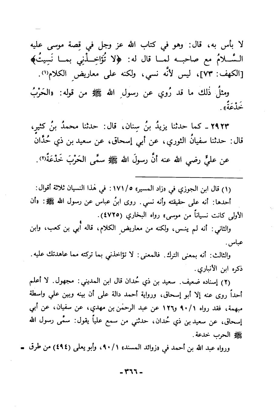 2923 - كَمَا حَدَّثَنَا يَزِيدُ بْنُ سِنَانٍ قَالَ: حَدَّثَنَا مُحَمَّدُ بْنُ كَثِيرٍ قَالَ: حَدَّثَنَا سُفْيَانُ الثَّوْرِيُّ، عَنْ أَبِي إِسْحَاقَ، عَنْ سَعِيدِ بْنِ ذِي حَدَّانَ، عَنْ عَلِيٍّ رَضِيَ اللهُ عَنْهُ: أَنَّ رَسُولَ اللهِ صَلَّى اللَّهُ عَلَيْهِ وَسَلَّمَ سَمَّى الْحَرْبَ خُدْعَةً