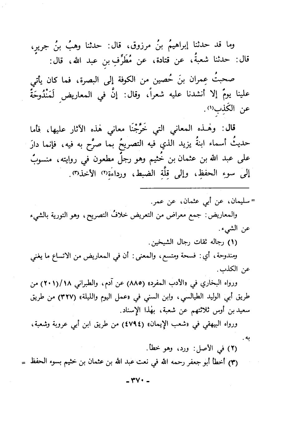 وَمَا قَدْ حَدَّثَنَا إِبْرَاهِيمُ بْنُ مَرْزُوقٍ قَالَ: حَدَّثَنَا وَهْبُ بْنُ جَرِيرٍ قَالَ: حَدَّثَنَا شُعْبَةُ، عَنْ قَتَادَةَ، عَنْ مُطَرِّفِ بْنِ عَبْدِ اللهِ قَالَ: صَحِبْتُ عِمْرَانَ بْنَ حُصَيْنٍ مِنَ الْكُوفَةِ إِلَى الْبَصْرَةِ , فَمَا كَانَ يَأْتِي عَلَيْنَا يَوْمٌ إِلَّا أَنْشَدْنَا عَلَيْهِ شِعْرًا , وَقَالَ: " إِنَّ فِي الْمَعَارِيضِ لَمَنْدُوحَةً عَنِ الْكَذِبِ " قَالَ: وَهَذِهِ الْمَعَانِي الَّتِي خَرَّجْنَا مَعَانِيَ هَذِهِ الْآثَارِ عَلَيْهَا , فَأَمَّا حَدِيثُ أَسْمَاءَ ابْنَةِ يَزِيدَ الَّذِي فِيهِ التَّصْرِيحُ بِمَا صَرَّحَ بِهِ فِيهِ فَإِنَّمَا دَارَ عَلَى عَبْدِ اللهِ بْنِ عُثْمَانَ بْنِ خُثَيْمٍ , وَهُوَ رَجُلٌ مَطْعُونٌ فِي رِوَايَتِهِ مَنْسُوبٌ إِلَى سُوءِ الْحِفْظِ , وَإِلَى قِلَّةِ الضَّبْطِ وَرَدَاءَةِ الْأَخْذِ , -[371]- وَأَمَّا حَدِيثُ أُمِّ كُلْثُومٍ فَمَنْ رَوَاهُ مِنْ أَهْلِ الْعِلْمِ الَّذِينَ يُؤْخَذُ مِثْلُهُ عَنْهُمْ فَإِنَّمَا ذُكِرَ فِيهِ نَفْيُ الْكَذِبِ , مِنْهُمْ مَالِكُ بْنُ أَنَسٍ , وَمِنْهُمْ صَالِحُ بْنُ كَيْسَانَ وَزَادَ عَلَى مَالِكٍ فِيهِ أَنَّ الَّذِي رَخَّصَ فِيهِ فَذَكَرَ تِلْكَ الْأَشْيَاءَ , ثُمَّ قَالَ: مِمَّا يَقُولُ النَّاسُ إِنَّهُ كَذِبٌ , فَأَضَافَ الْكَذِبَ إِلَى قَوْلِ النَّاسِ فِي تِلْكَ الْأَشْيَاءِ , لَا إِلَى حَقَائِقِ تِلْكَ الْأَشْيَاءِ , وَاللهَ نَسْأَلُهُ التَّوْفِيقَ