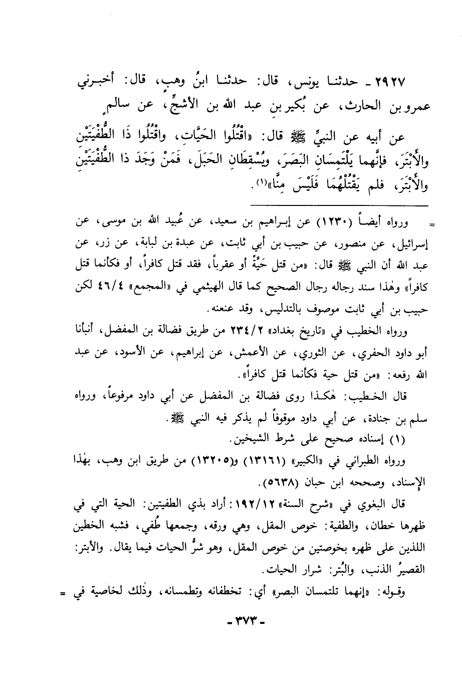 2927 - حَدَّثَنَا يُونُسُ قَالَ: حَدَّثَنَا ابْنُ وَهْبٍ قَالَ: أَخْبَرَنِي عَمْرُو بْنُ الْحَارِثِ، عَنْ بُكَيْرِ بْنِ عَبْدِ اللهِ بْنِ الْأَشَجِّ، عَنْ سَالِمٍ، عَنْ أَبِيهِ، عَنْ النَّبِيِّ صَلَّى اللَّهُ عَلَيْهِ وَسَلَّمَ قَالَ: " اقْتُلُوا الْحَيَّاتِ , وَاقْتُلُوا ذَا الطُّفْيَتَيْنِ , وَالْأَبْتَرَ , فَإِنَّهُمَا يَلْتَمِسَانِ الْبَصَرَ وَيُسْقِطَانِ الْحَبَلَ , فَمَنْ وَجَدَ ذَا الطُّفْيَتَيْنِ وَالْأَبْتَرَ فَلَمْ يَقْتُلْهُمَا , فَلَيْسَ مِنَّا "