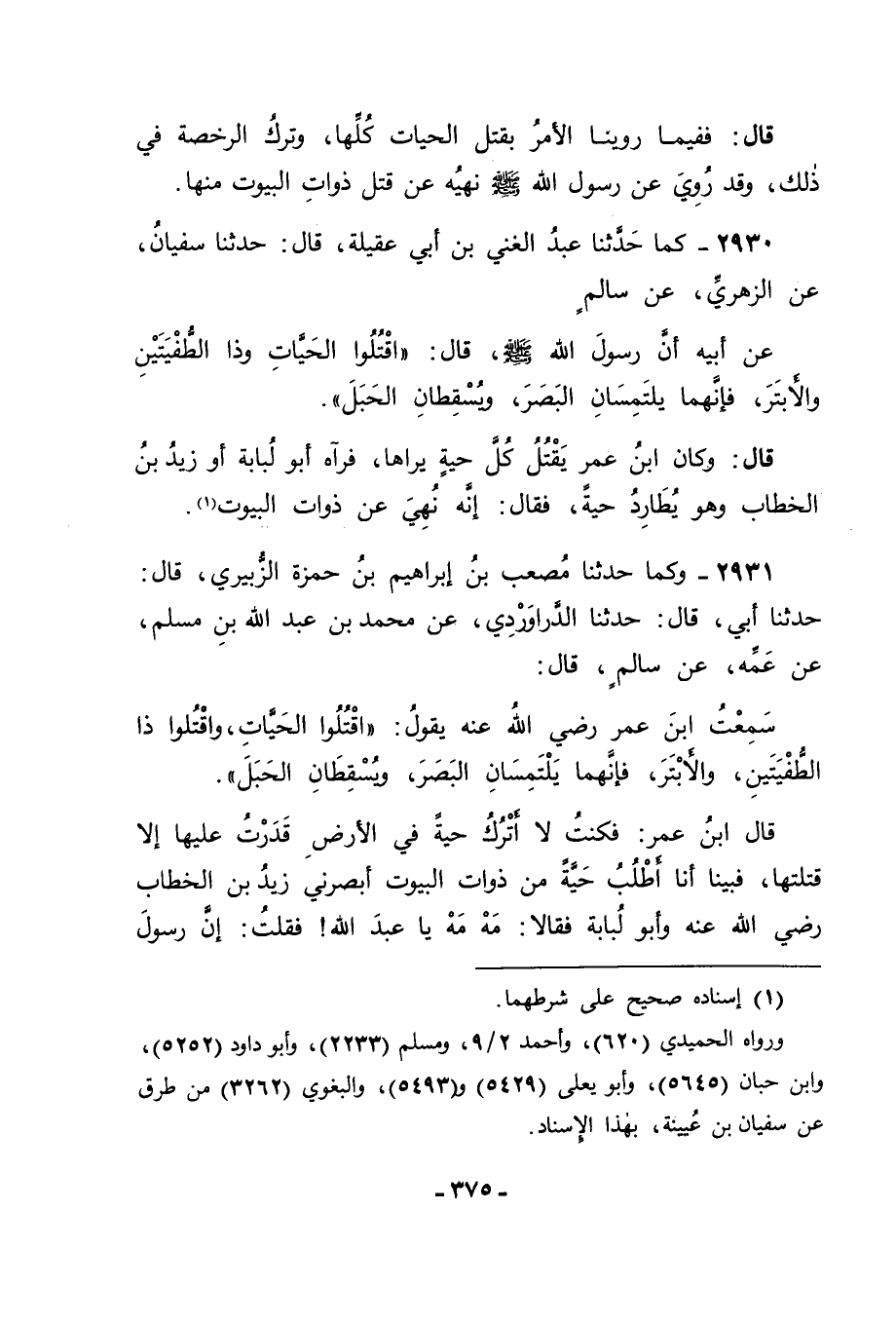 2931 - وَكَمَا حَدَّثَنَا مُصْعَبُ بْنُ إِبْرَاهِيمَ بْنِ حَمْزَةَ الزُّبَيْرِيُّ قَالَ: حَدَّثَنَا أَبِي قَالَ: حَدَّثَنَا الدَّرَاوَرْدِيُّ، عَنْ مُحَمَّدِ بْنِ عَبْدِ اللهِ بْنِ مُسْلِمٍ، عَنْ عَمِّهِ، عَنْ سَالِمٍ قَالَ: سَمِعْتُ ابْنَ عُمَرَ رَضِيَ اللهُ عَنْهُ يَقُولُ: " اقْتُلُوا الْحَيَّاتِ , وَاقْتُلُوا ذَا الطُّفْيَتَيْنِ وَالْأَبْتَرَ , فَإِنَّهُمَا يَلْتَمِسَانِ الْبَصَرَ , وَيُسْقِطَانِ الْحَبَلَ "، قَالَ ابْنُ عُمَرَ , فَكُنْتُ لَا أَتْرُكُ حَيَّةً فِي الْأَرْضِ قَدَرْتُ عَلَيْهَا إِلَّا قَتَلْتُهَا , فَبَيْنَا أَنَا أَطْلُبُ حَيَّةً مِنْ ذَوَاتِ الْبُيُوتِ أَبْصَرَنِي زَيْدُ بْنُ الْخَطَّابِ رَضِيَ اللهُ عَنْهُ وَأَبُو لُبَابَةَ , فَقَالَا: مَهْ مَهْ يَا عَبْدَ اللهِ , فَقُلْتُ: إِنَّ رَسُولَ -[376]- اللهِ صَلَّى اللَّهُ عَلَيْهِ وَسَلَّمَ أَمَرَنَا بِقَتْلِهَا , فَقَالَ: لَا، فَإِنَّهُ قَدْ نَهَى عَنْ ذَوَاتِ الْبُيُوتِ، يُرِيدُ عَوَامِرَ الْبُيُوتِ "