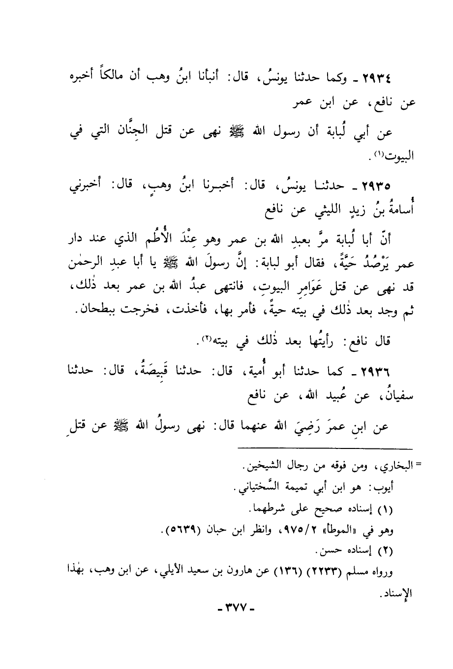 2934 - وَكَمَا حَدَّثَنَا يُونُسُ قَالَ: أَنْبَأَنَا ابْنُ وَهْبٍ، أَنَّ مَالِكًا أَخْبَرَهُ، عَنْ نَافِعٍ، عَنِ ابْنِ عُمَرَ، عَنْ أَبِي لُبَابَةَ أَنَّ رَسُولَ اللهِ صَلَّى اللَّهُ عَلَيْهِ وَسَلَّمَ نَهَى عَنْ قَتْلِ -[378]- الْجِنَّانِ الَّتِي فِي الْبُيُوتِ