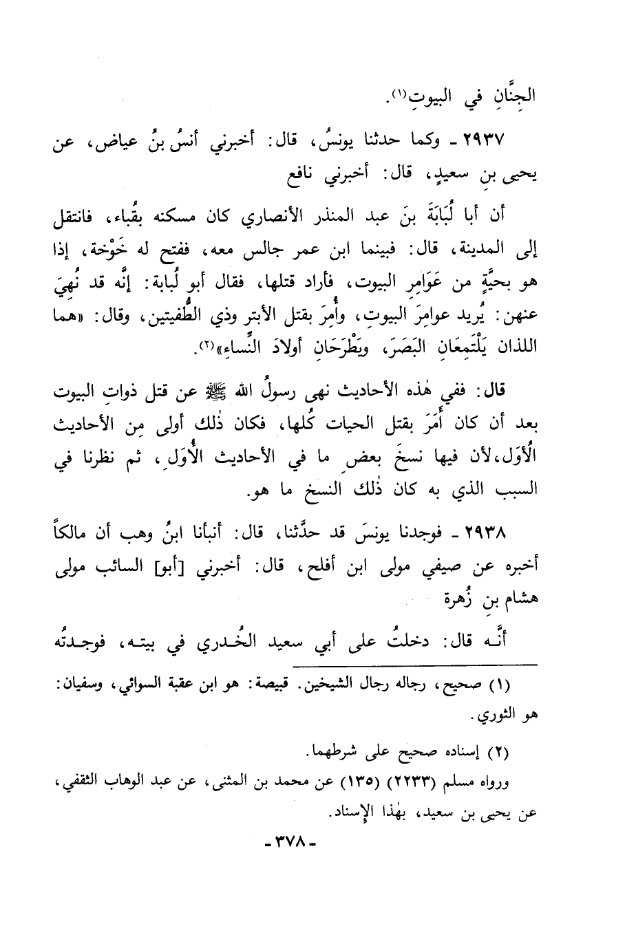 2937 - وَكَمَا حَدَّثَنَا يُونُسُ قَالَ: أَخْبَرَنِي أَنَسُ بْنُ عِيَاضٍ، عَنْ يَحْيَى بْنِ سَعِيدٍ قَالَ: أَخْبَرَنِي نَافِعٌ، أَنَّ أَبَا لُبَابَةَ بْنَ عَبْدِ الْمُنْذِرِ الْأَنْصَارِيَّ كَانَ مَسْكَنُهُ بِقُبَاءَ , فَانْتَقَلَ إِلَى الْمَدِينَةِ , قَالَ: فَبَيْنَمَا ابْنُ عُمَرَ جَالِسٌ مَعَهُ , فَفَتَحَ لَهُ خَوْخَةً , إِذَا هُوَ بِحَيَّةٍ مِنْ عَوَامِرِ الْبُيُوتِ , فَأَرَادَ قَتْلَهَا , فَقَالَ أَبُو لُبَابَةَ: إِنَّهُ قَدْ نَهَى عَنْهُنَّ. يُرِيدُ عَوَامِرَ الْبُيُوتِ , وَأَمَرَ بِقَتْلِ الْأَبْتَرِ وَذِي الطُّفْيَتَيْنِ , وَقَالَ: هُمَا اللَّذَانِ يَلْتَمِعَانِ الْبَصَرَ , وَيَطْرَحَانِ أَوْلَادَ النِّسَاءِ قَالَ: فَفِي هَذِهِ الْأَحَادِيثِ نَهَى رَسُولُ اللهِ صَلَّى اللَّهُ عَلَيْهِ وَسَلَّمَ عَنْ قَتْلِ ذَوَاتِ الْبُيُوتِ بَعْدَ أَنْ كَانَ أَمَرَ بِقَتْلِ الْحَيَّاتِ كُلِّهَا , فَكَانَ ذَلِكَ أَوْلَى مِنَ الْأَحَادِيثِ الْأُوَلِ ; لِأَنَّ فِيهَا نَسْخَ بَعْضِ مَا فِي الْأَحَادِيثِ الْأُوَلِ , ثُمَّ نَظَرْنَا فِي السَّبَبِ الَّذِي بِهِ كَانَ ذَلِكَ النَّسْخُ مَا هُوَ