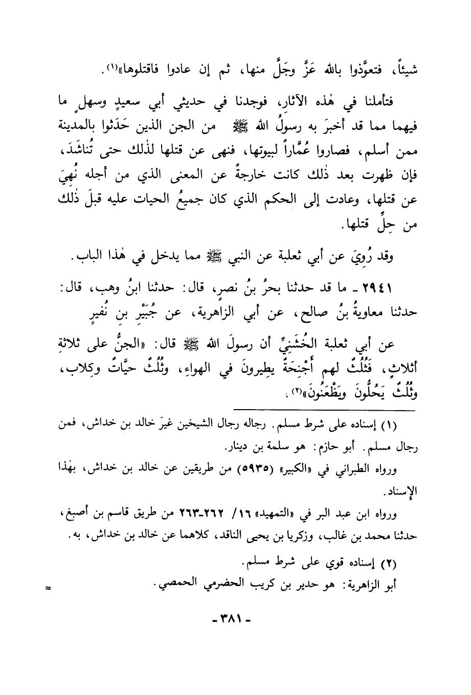 2941 - مَا قَدْ حَدَّثَنَا بَحْرُ بْنُ نَصْرٍ قَالَ: حَدَّثَنَا ابْنُ وَهْبٍ قَالَ: حَدَّثَنَا مُعَاوِيَةُ بْنُ صَالِحٍ، عَنْ أَبِي الزَّاهِرِيَّةِ، عَنْ جُبَيْرِ بْنِ نُفَيْرٍ، عَنْ أَبِي ثَعْلَبَةَ الْخُشَنِيِّ أَنَّ رَسُولَ اللهِ صَلَّى اللَّهُ عَلَيْهِ وَسَلَّمَ قَالَ: " الْجِنُّ عَلَى ثَلَاثَةِ أَثْلَاثٍ: فَثُلُثٌ لَهُمْ أَجْنِحَةٌ يَطِيرُونَ فِي الْهَوَاءِ، وَثُلُثٌ حَيَّاتٌ وَكِلَابٌ، وَثُلُثٌ يَحُلُّونَ وَيَظْعَنُونَ " -[382]- فَكَانَ ذَلِكَ مِمَّا قَدْ حُقِّقَ أَنَّ مِنَ الْحَيَّاتِ مَا هُوَ جَانٌّ , وَأَنَّ فِيهِ مَا قَدْ أَمَرَ بِهِ رَسُولُ اللهِ صَلَّى اللَّهُ عَلَيْهِ وَسَلَّمَ فِي حَدِيثَيْ أَبِي سَعِيدٍ، وَسَهْلٍ وَاللهَ سُبْحَانَهُ وَتَعَالَى نَسْأَلُهُ التَّوْفِيقَ