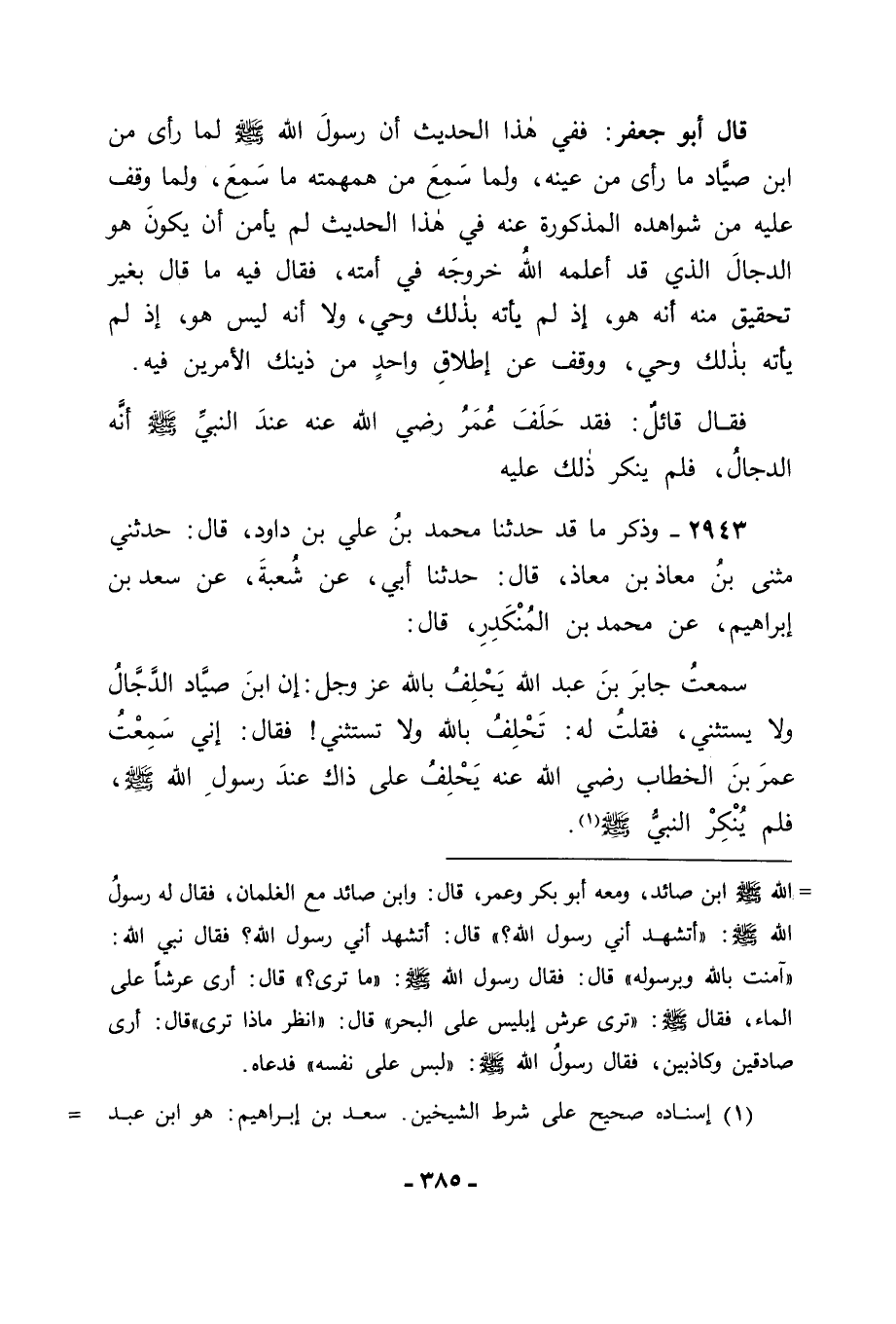 2943 - وَذَكَرَ مَا قَدْ حَدَّثَنَا مُحَمَّدُ بْنُ عَلِيِّ بْنِ دَاوُدَ قَالَ: حَدَّثَنِي مُثَنَّى بْنُ مُعَاذِ بْنِ مُعَاذٍ قَالَ: حَدَّثَنِي أَبِي، عَنْ شُعْبَةَ، عَنْ سَعْدِ بْنِ إِبْرَاهِيمَ، عَنْ مُحَمَّدِ بْنِ الْمُنْكَدِرِ، قَالَ: سَمِعْتُ جَابِرَ بْنَ عَبْدِ اللهِ، يَحْلِفُ بِاللهِ عَزَّ وَجَلَّ إِنَّ ابْنَ صَيَّادٍ الدَّجَّالُ , وَلَا يَسْتَثْنِي , فَقُلْتُ لَهُ: تَحْلِفُ بِاللهِ , وَلَا تَسْتَثْنِي , فَقَالَ: إِنِّي سَمِعْتُ عُمَرَ بْنَ الْخَطَّابِ رَضِيَ اللهُ عَنْهُ يَحْلِفُ عَلَى ذَاكَ عِنْدَ رَسُولِ اللهِ صَلَّى اللَّهُ عَلَيْهِ وَسَلَّمَ , فَلَمْ يُنْكِرِ النَّبِيُّ صَلَّى اللَّهُ عَلَيْهِ وَسَلَّمَ " -[386]-